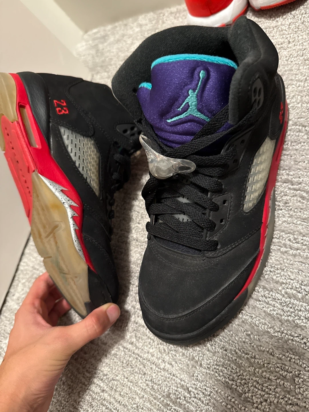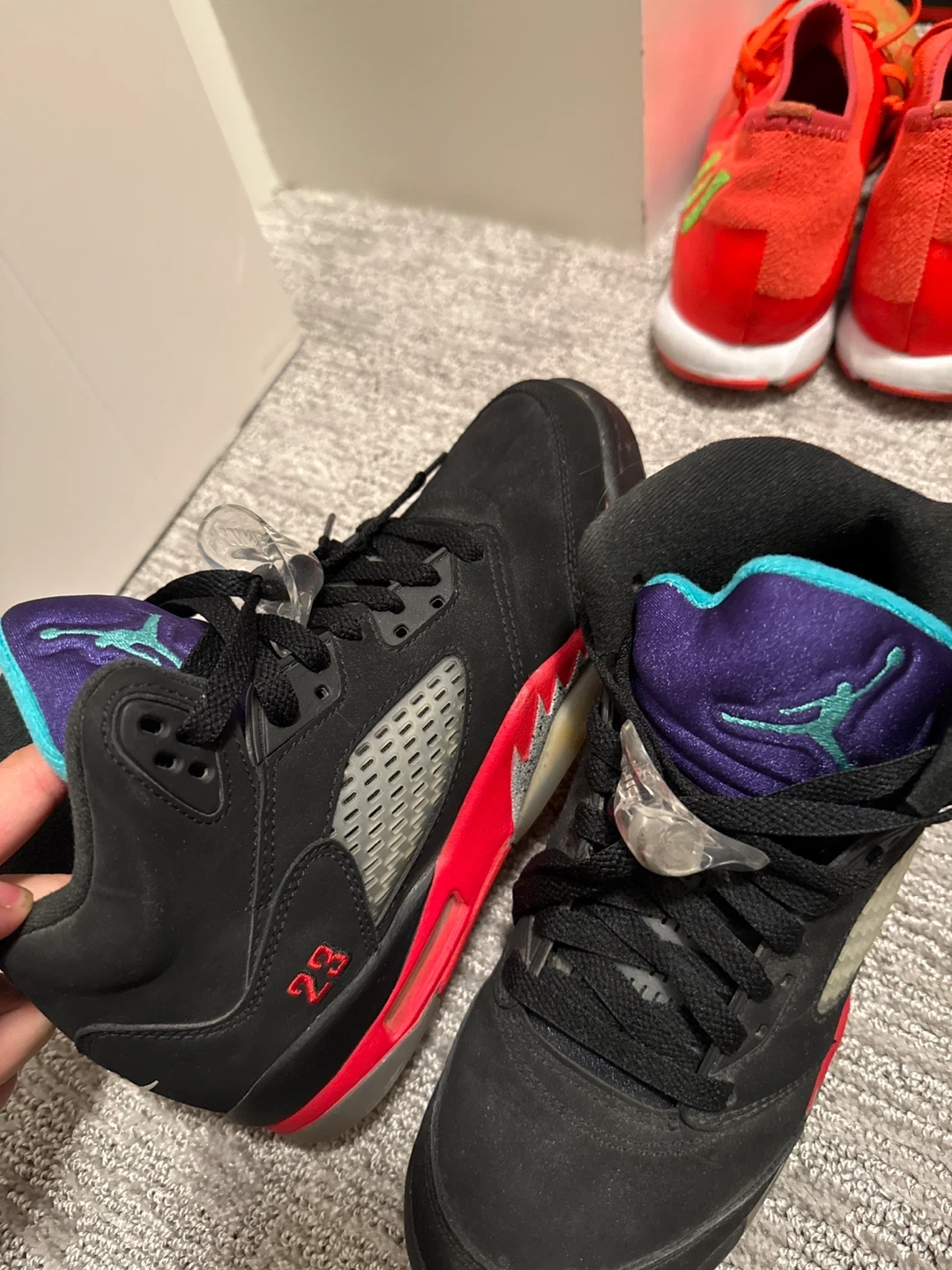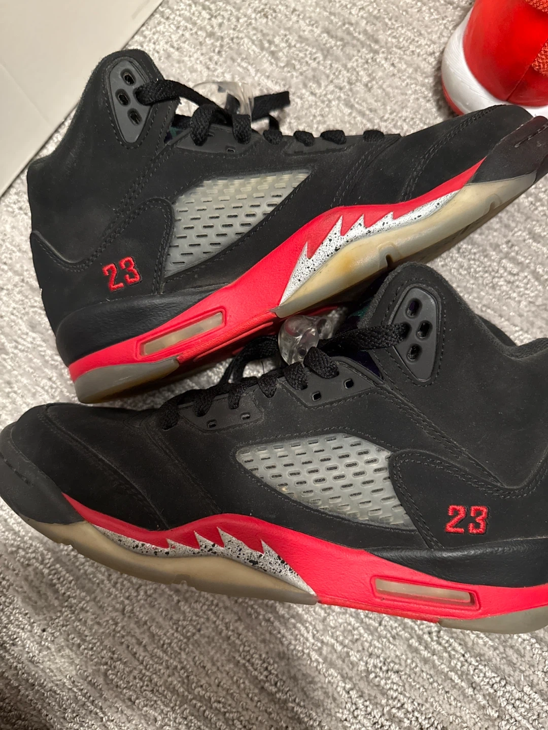 10Selling a pair of Nike Air Jordan 5 Retro in a striking black and red colourway. The shoes are a size 5.5. They feature the number '23' on the side and a distinctive design. Perfect for any sneaker enthusiast! No box