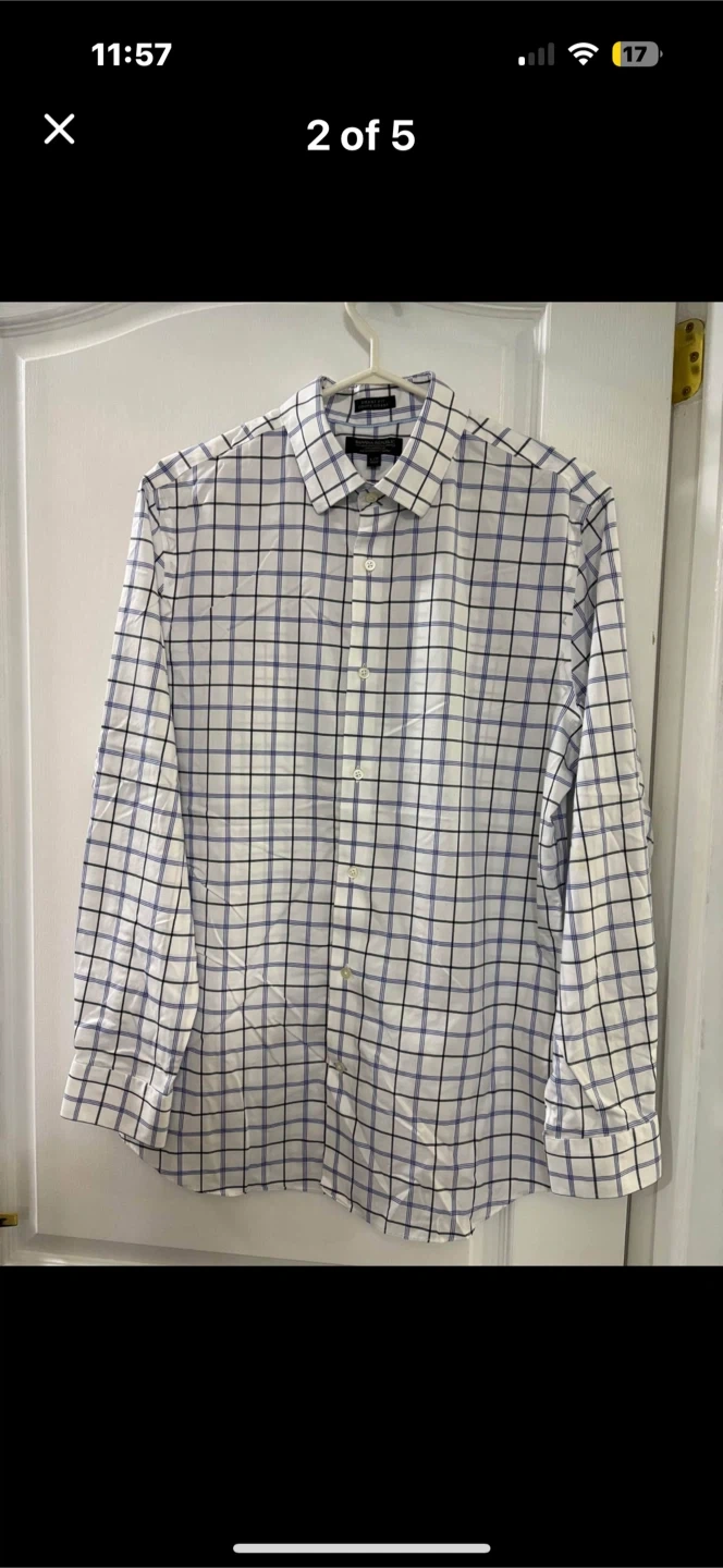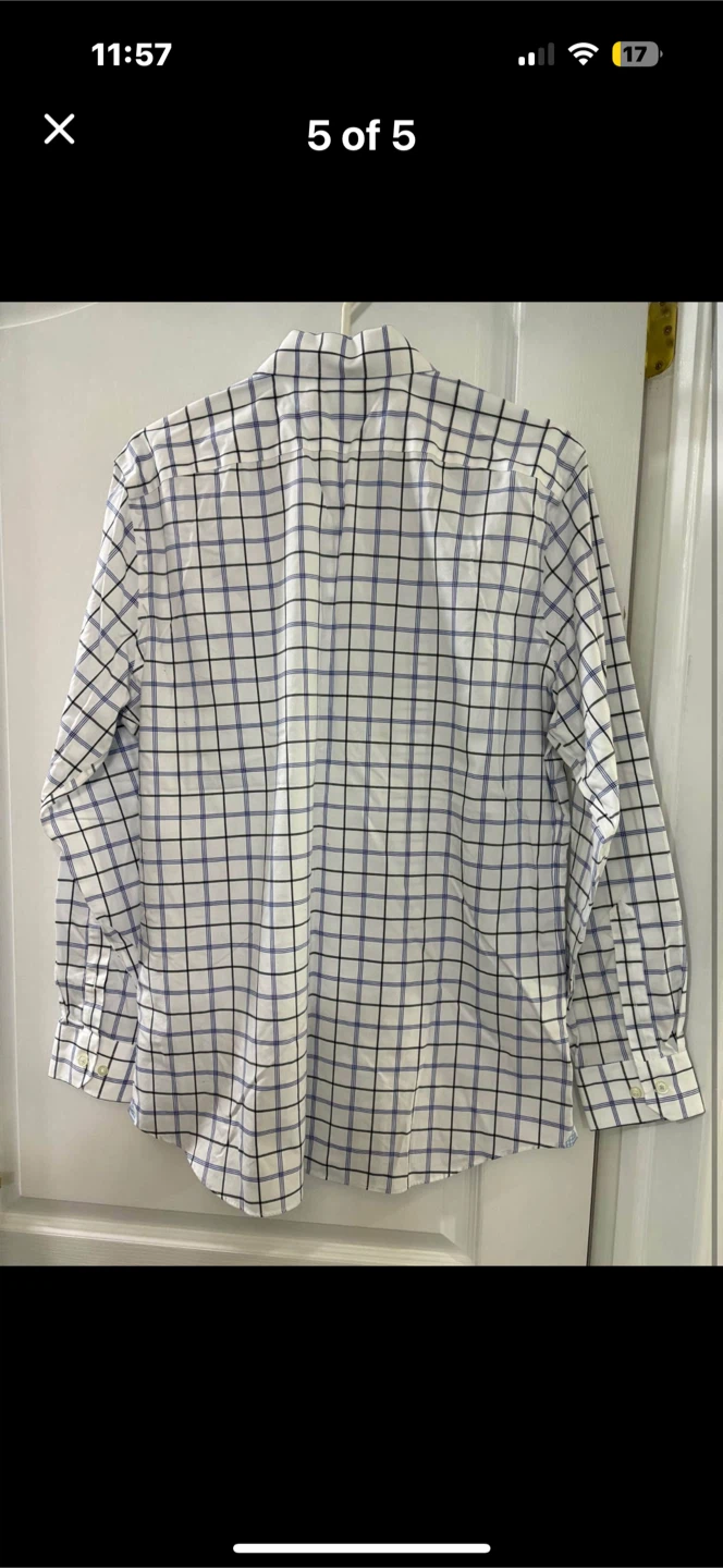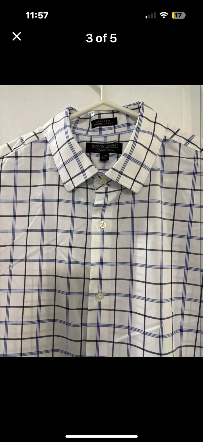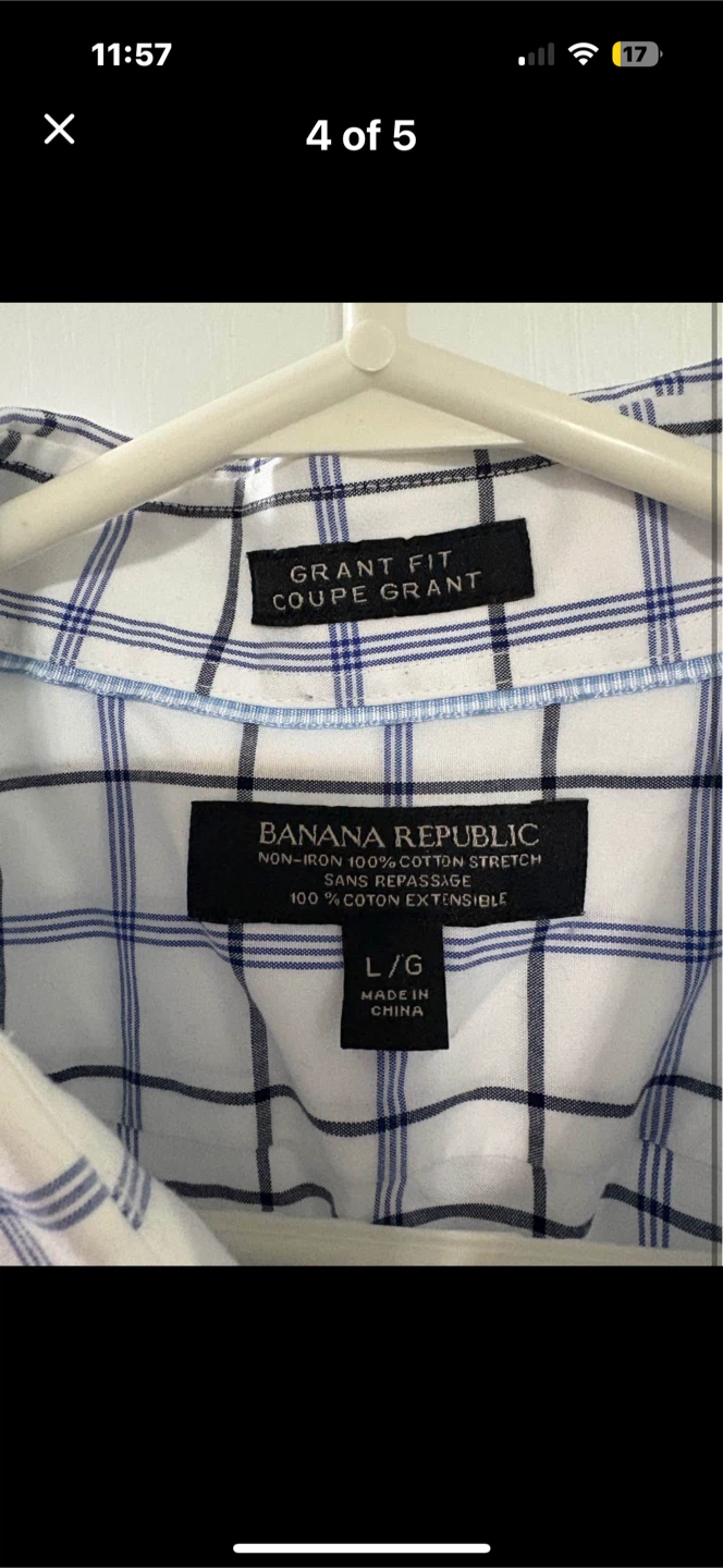 Here's a Banana Republic button-down shirt in size large! It's a Grant Fit style and features a blue and black plaid pattern. The material is non-iron and made of 100% cotton!