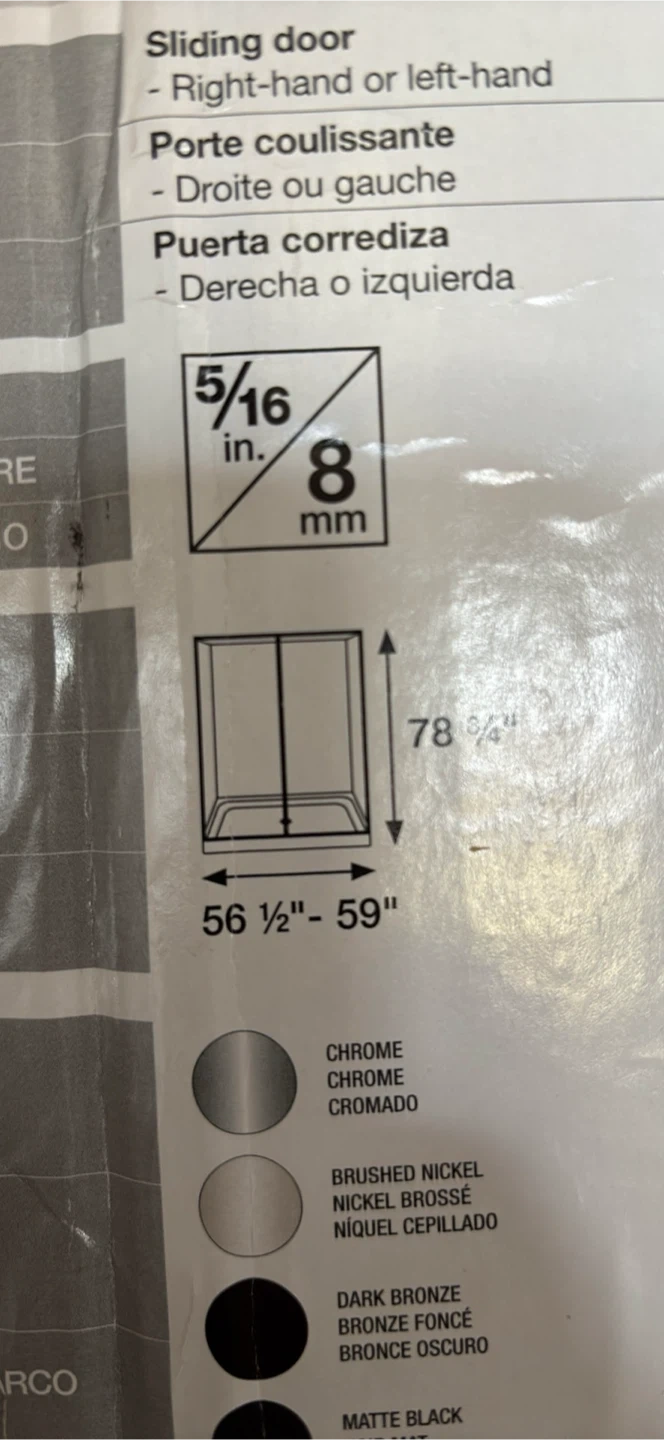 Selling a MAAX Halo shower door. It's designed for right or left-hand sliding. The door measures 56 1/2"-59" x 78 3/4". It also comes with a luxurious 15 1/2" door handle and all the installation instructions