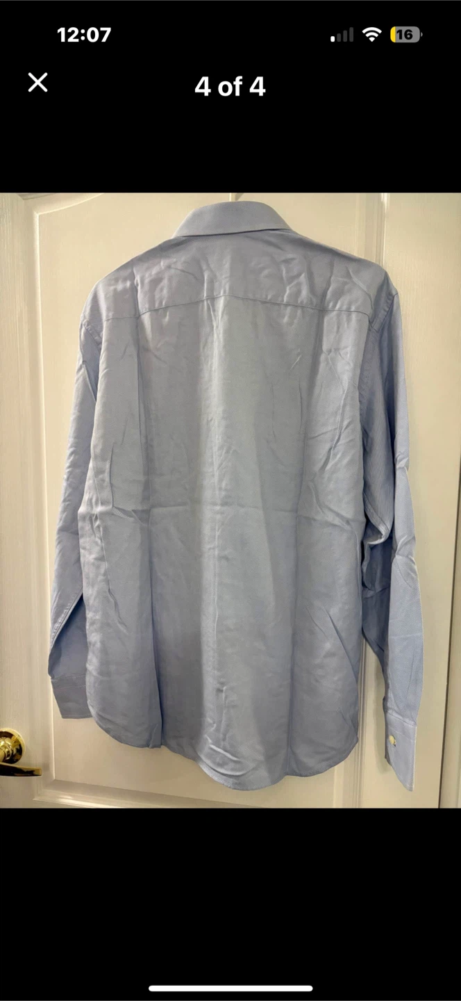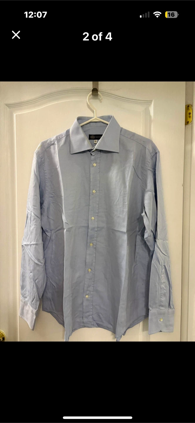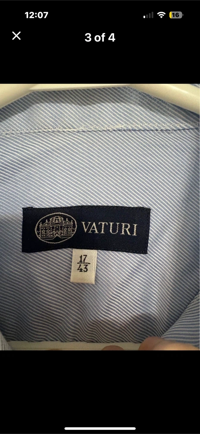 Selling a Vaturi dress shirt in size 17/43 or L/XL. It's a light blue colour with a subtle striped pattern. Perfect for business or casual wear!