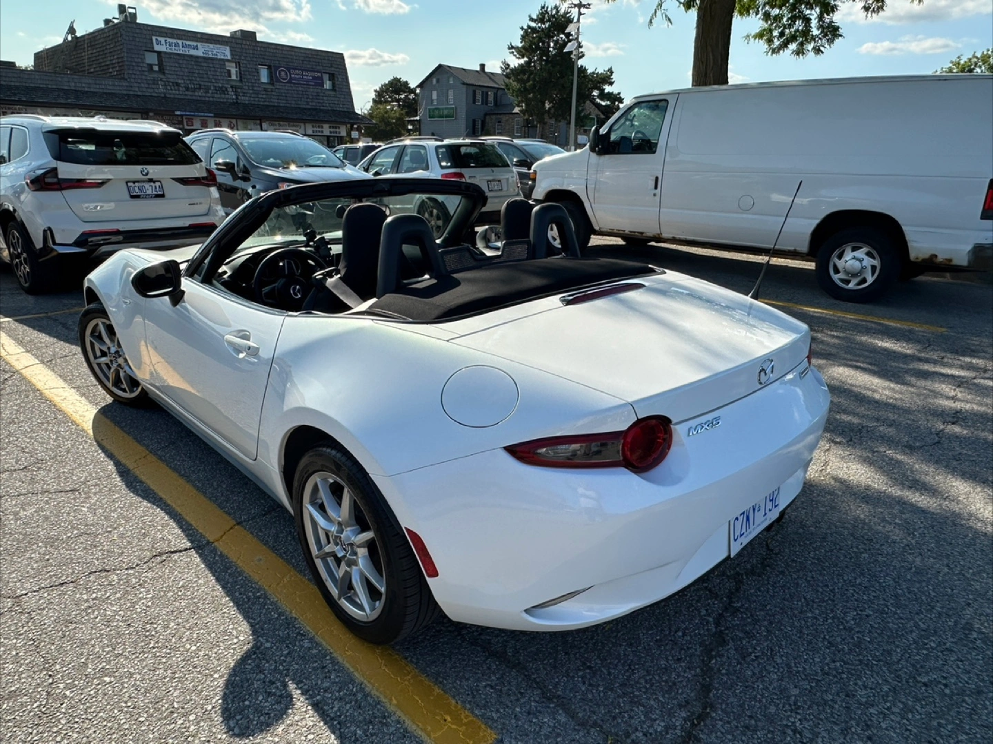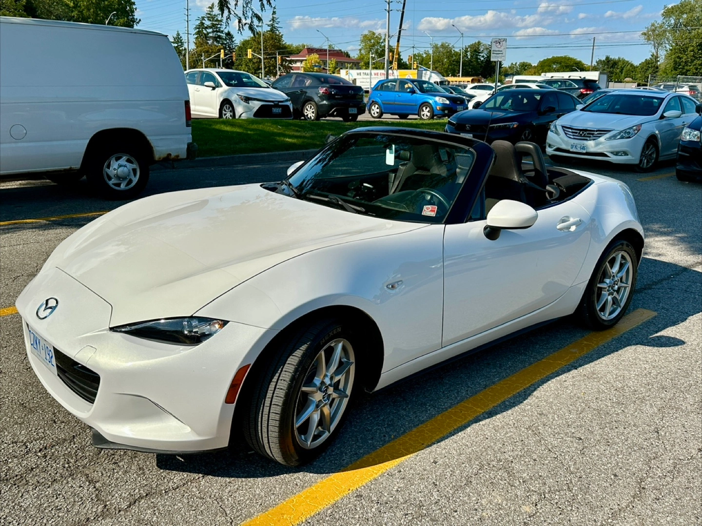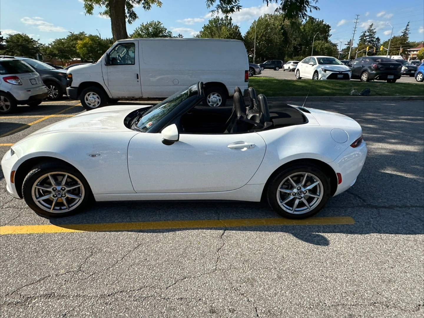Free coffee with sale of White Mazda MX-5 Miata convertible. 59’000km onvertible with black interior and leather accents,