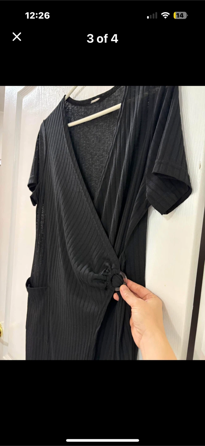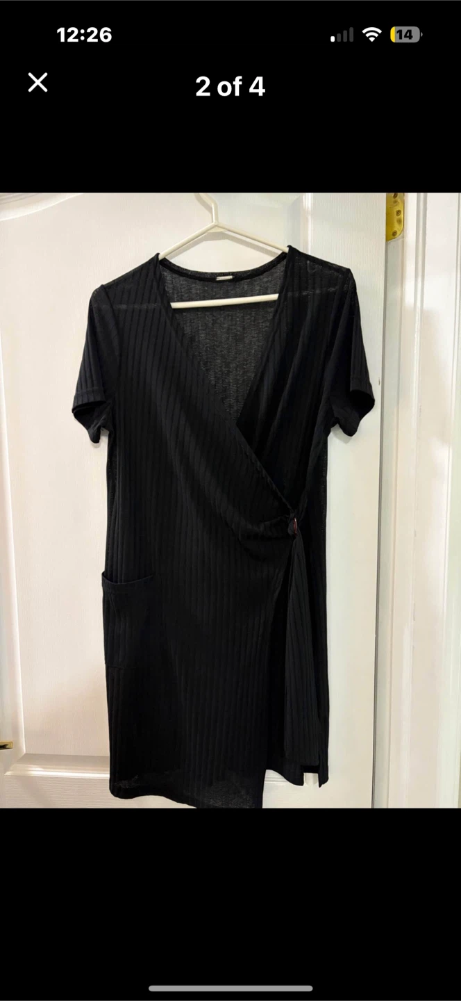 Selling a cute black ribbed dress! Size medium. It has short sleeves, a V-neck, and a unique wrap detail with a ring accent. Perfect for a casual day out or dressed up for an evening event
