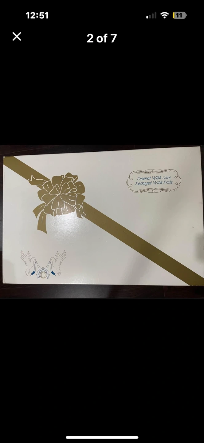Professionally preserved in a sealed box, dry cleaned, mint/excellent condition with tag 🏷️ The skirt part is in tulle material with little white daisies and the bodice is silk with buttons in the back covered in silk material, off shoulder