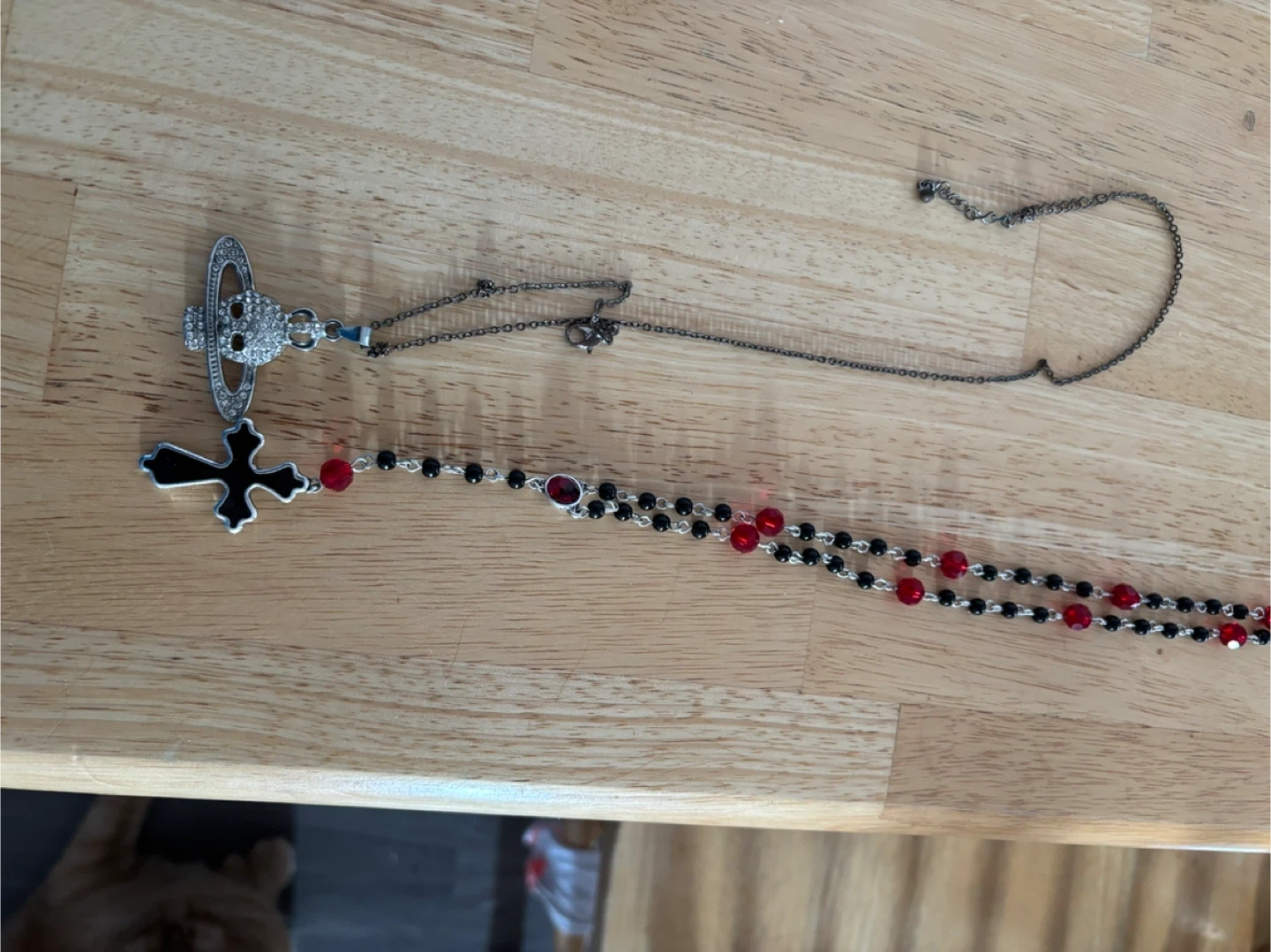 Selling a Vivienne Westwood Orb Rosary Necklace. It features the iconic orb pendant with a skull design, along with a rosary-style chain with black and red beads. A unique and stylish accessory! 2 for $20