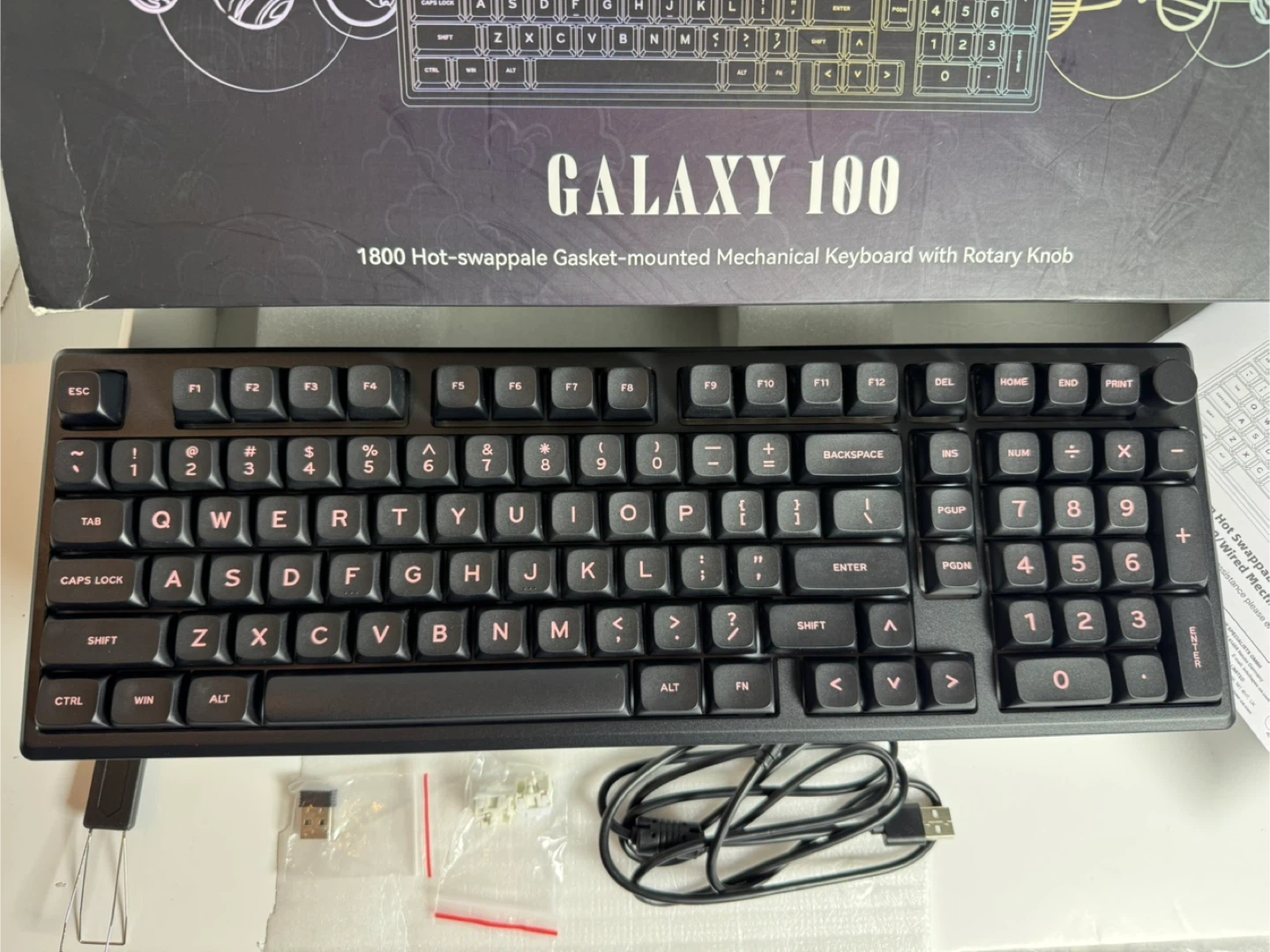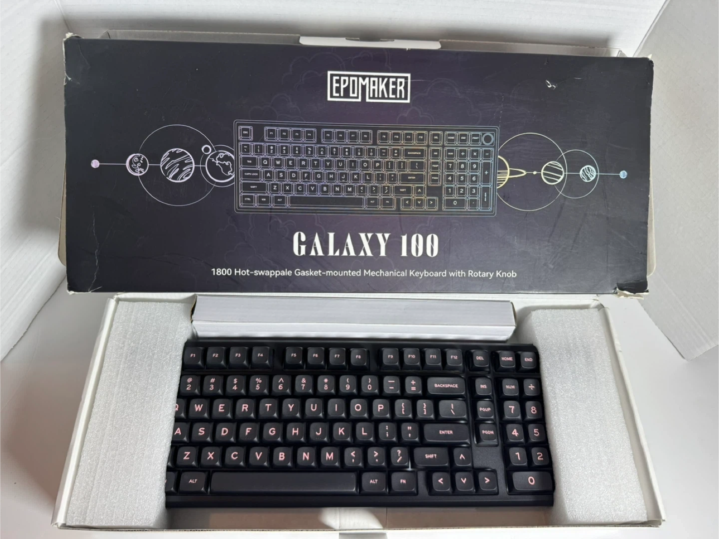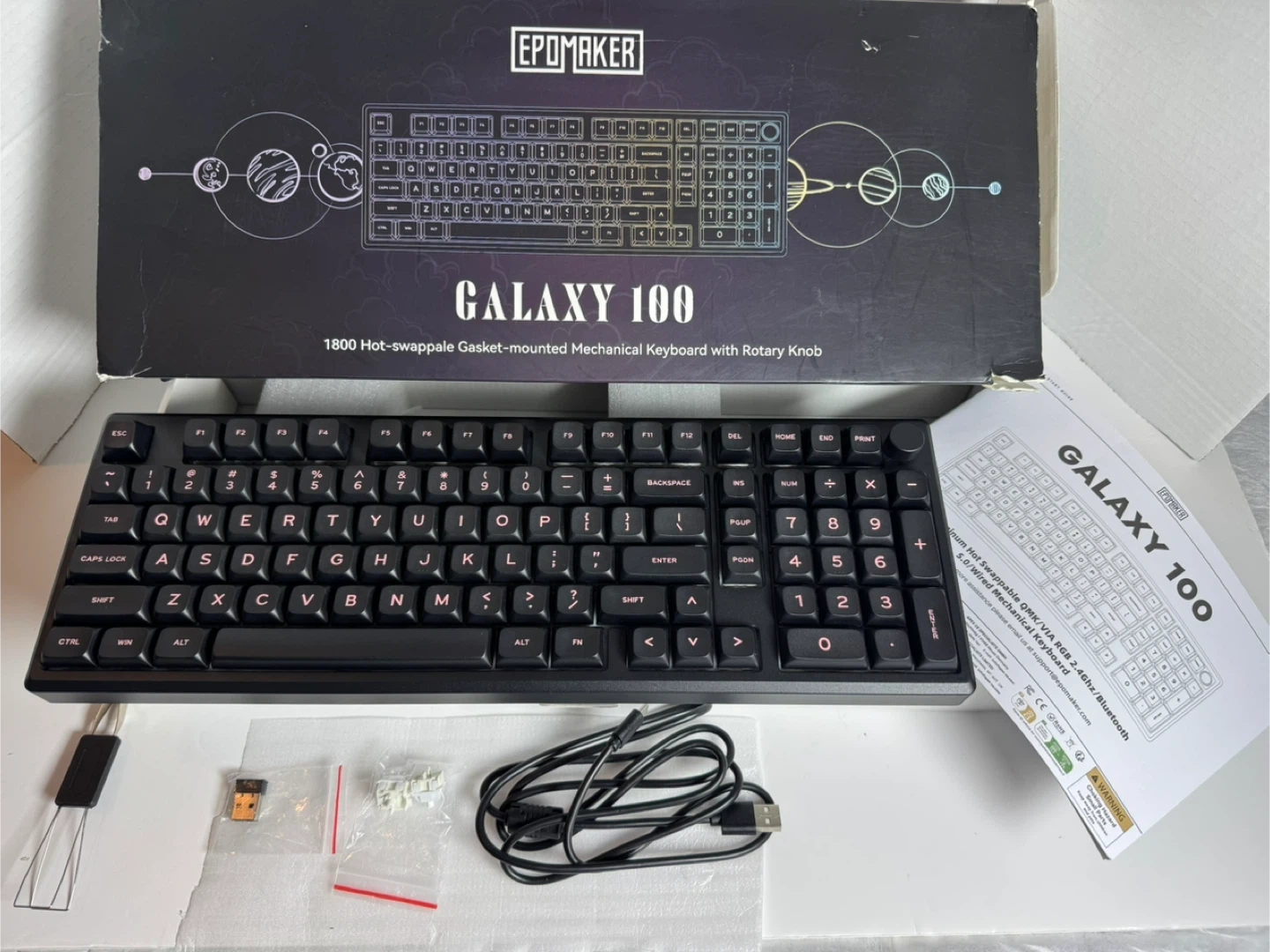 Selling an Epomaker Galaxy 100 1800 hot-swappable gasket-mounted mechanical keyboard with a rotary knob. It's in excellent condition and comes with the original box and accessories! Included are the USB receiver, extra switches, and a cable. The keyboard also features RGB lighting for a customizable look!