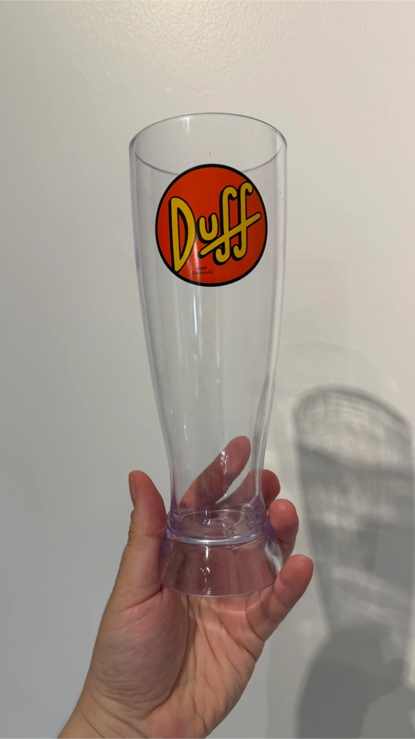 Selling a Duff beer glass featuring the logo from The Simpsons. Made of plastic. Bought is California. Unused