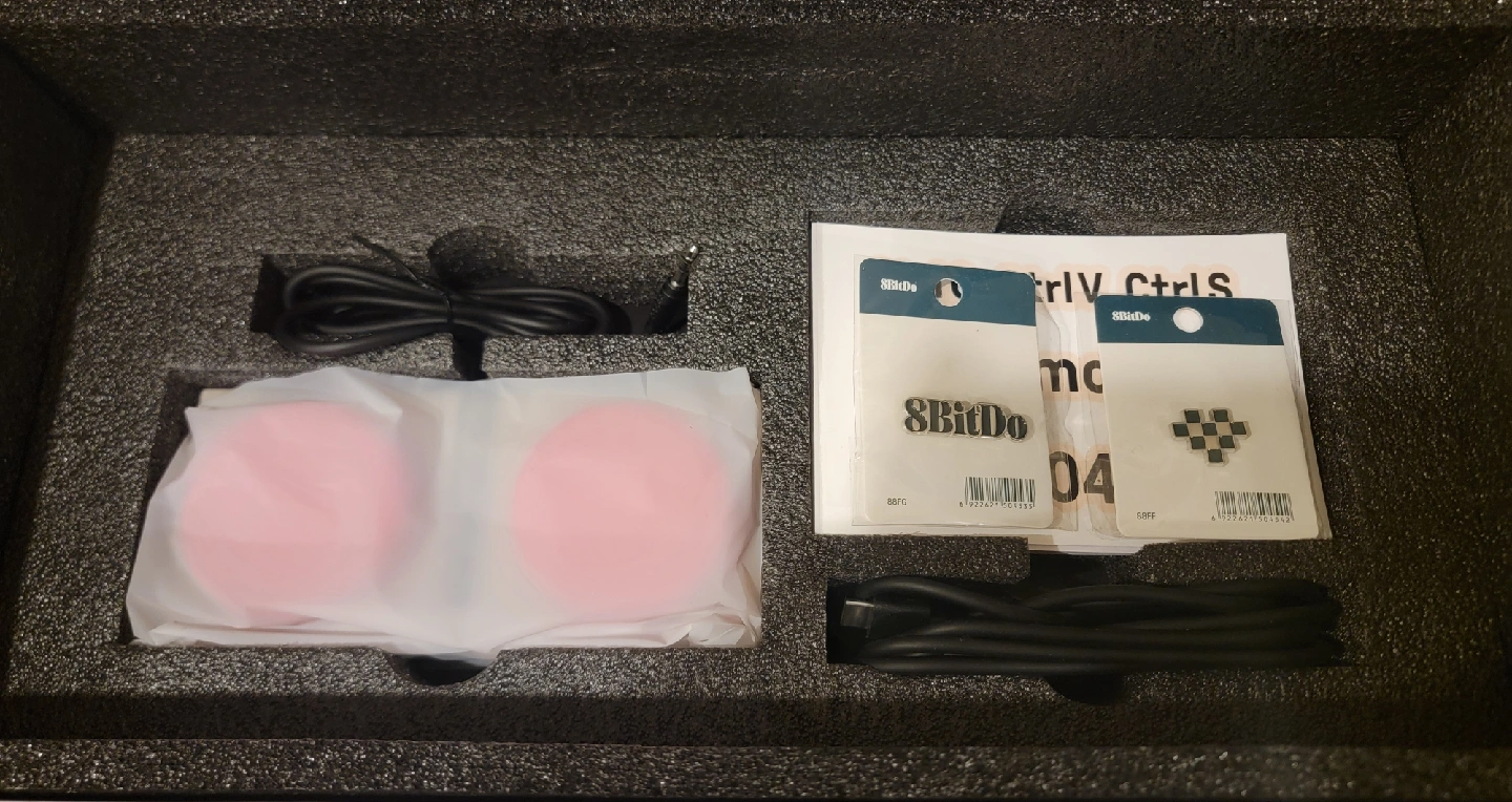 8bitdo retro mechanical keyboard. Tri mode wireless/bluetooth/wired. Hotswappable 5 pin Kailh box white v2 switches. Box includes retro keyboard, dual super button, 2 pins, 2 sticker packs, cable and manual.