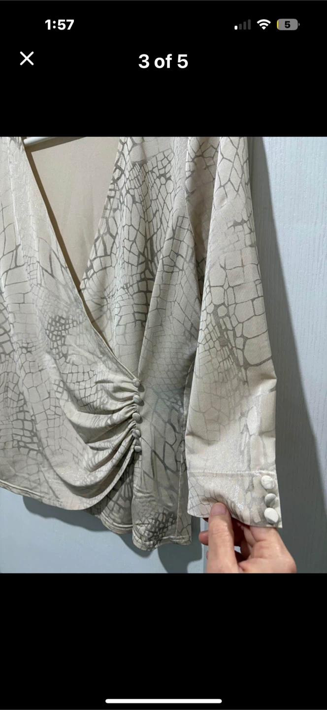 Tribal wrap blouse in a size medium. It features a stylish wrap design with a flattering V-neck and 3/4 sleeves. The beige colour and subtle pattern make it versatile for various occasions. Made in Bulgaria