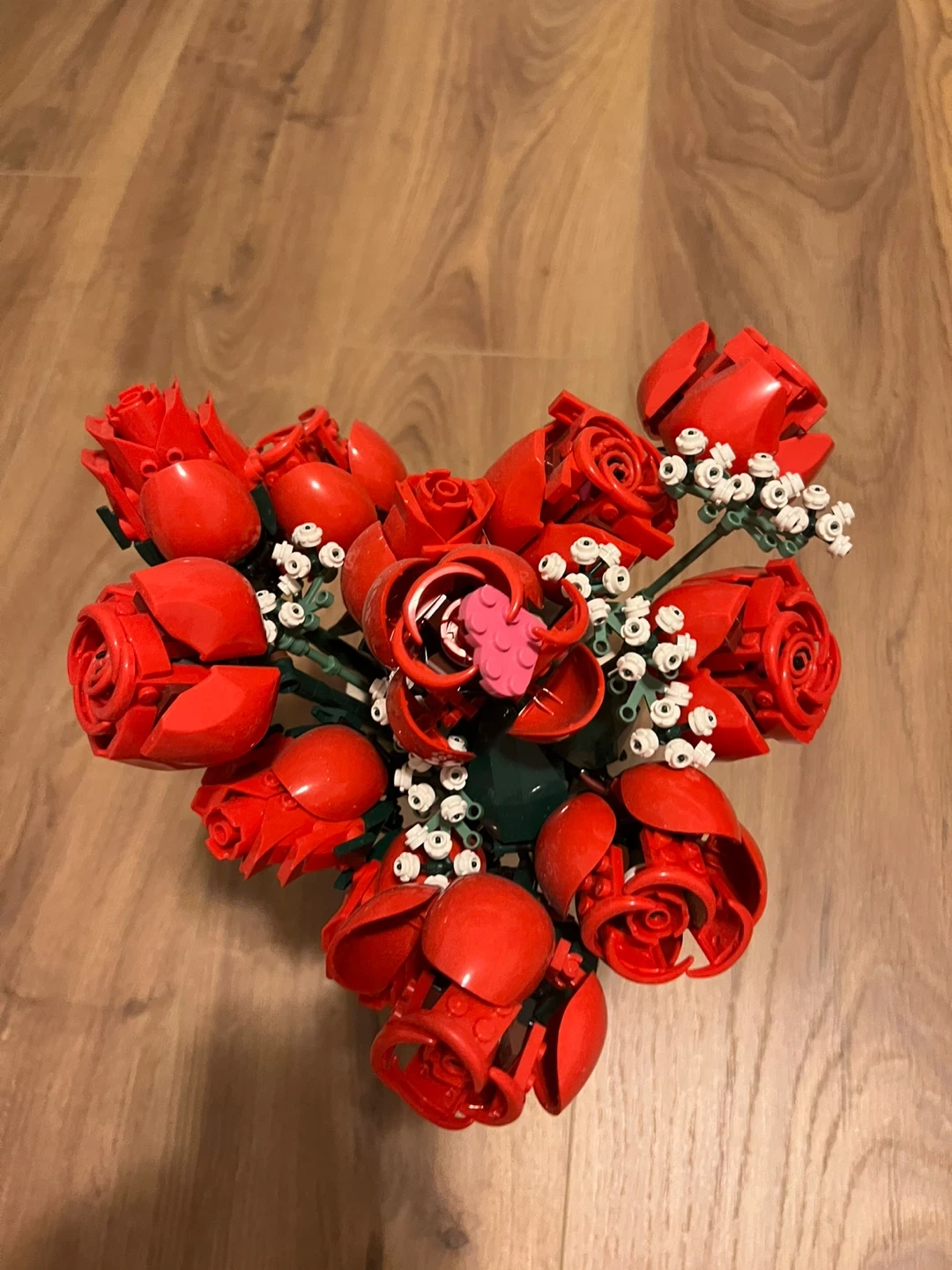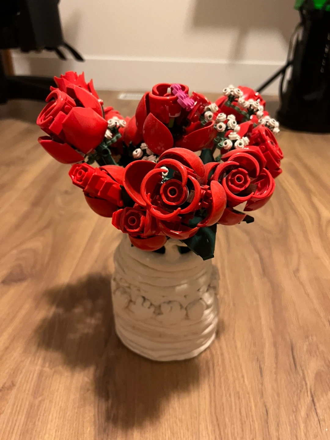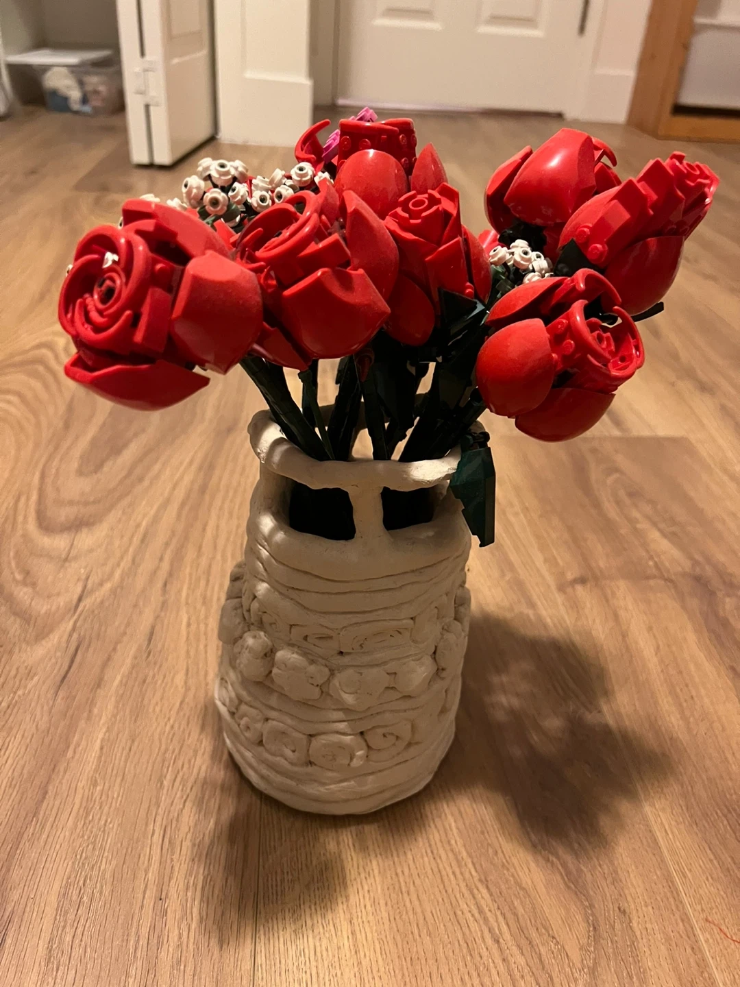 Selling a beautiful assembled LEGO flower bouquet, complete with a handmade vase! The vase can be painted! Paints can be included with an additional cost. The bouquet features vibrant red roses and delicate white accents. It's a unique and eye-catching display piece for any room. Perfect for LEGO lovers and flower enthusiasts alike!