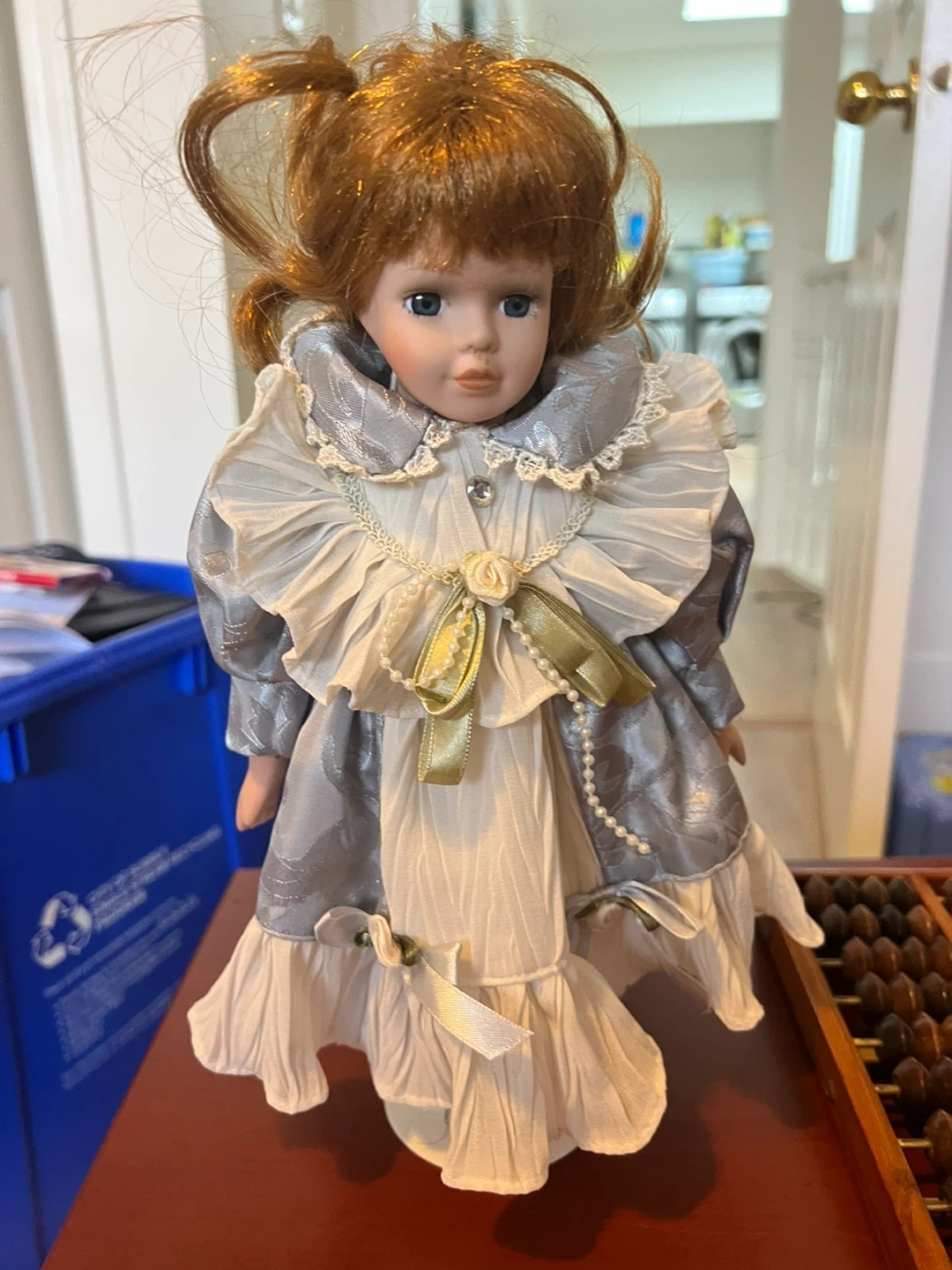 A beautiful porcelain doll, dressed in a lovely silver and white gown. The doll features intricate details and would make a wonderful addition to any collection or a charming decorative piece for your home