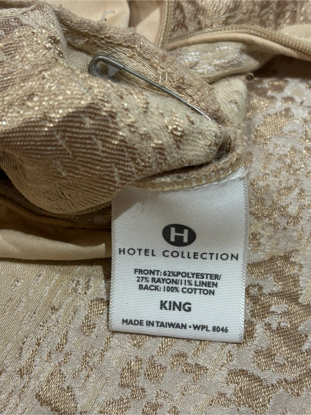Selling a Hotel Collection king size Duvet cover . It is made of 62% polyester, 27% rayon, 11% linen on the front and 100% cotton on the back.