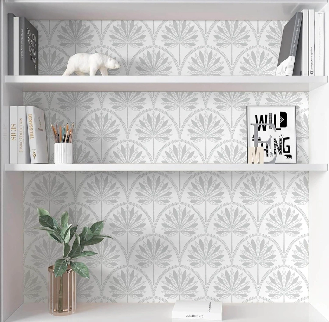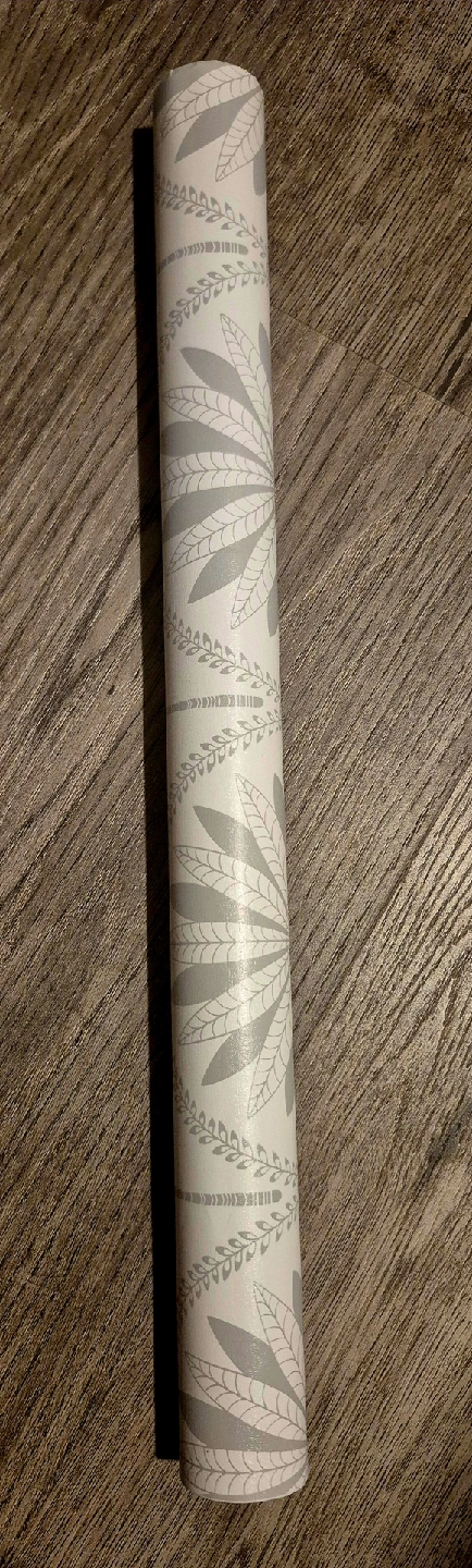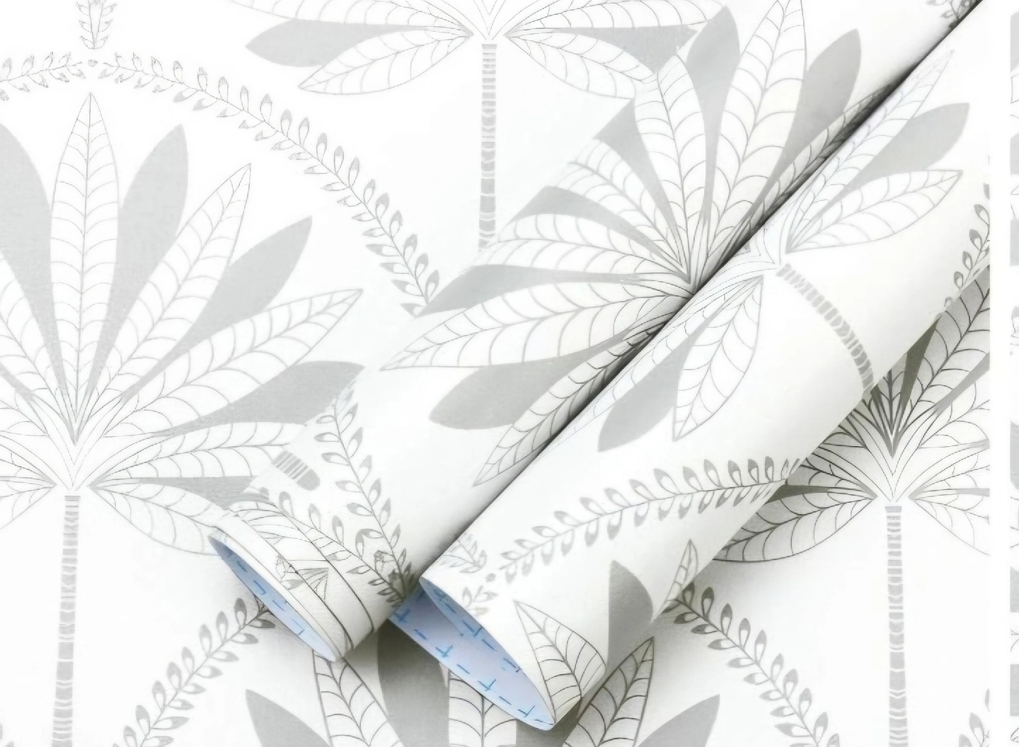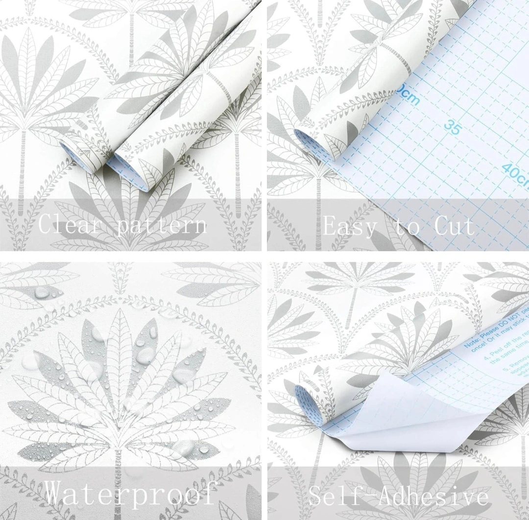Spruce up your space with this stylish removable wallpaper! Featuring a silver and white palm leaf pattern, it's easy to cut and apply.
