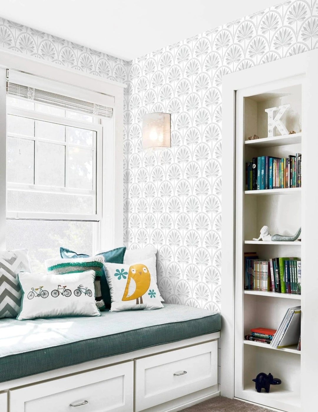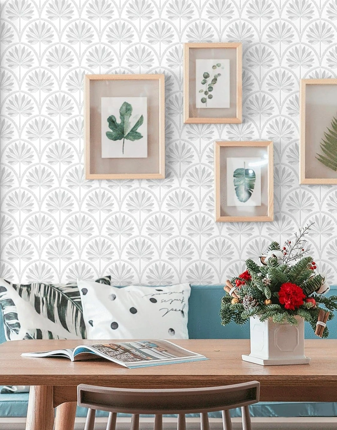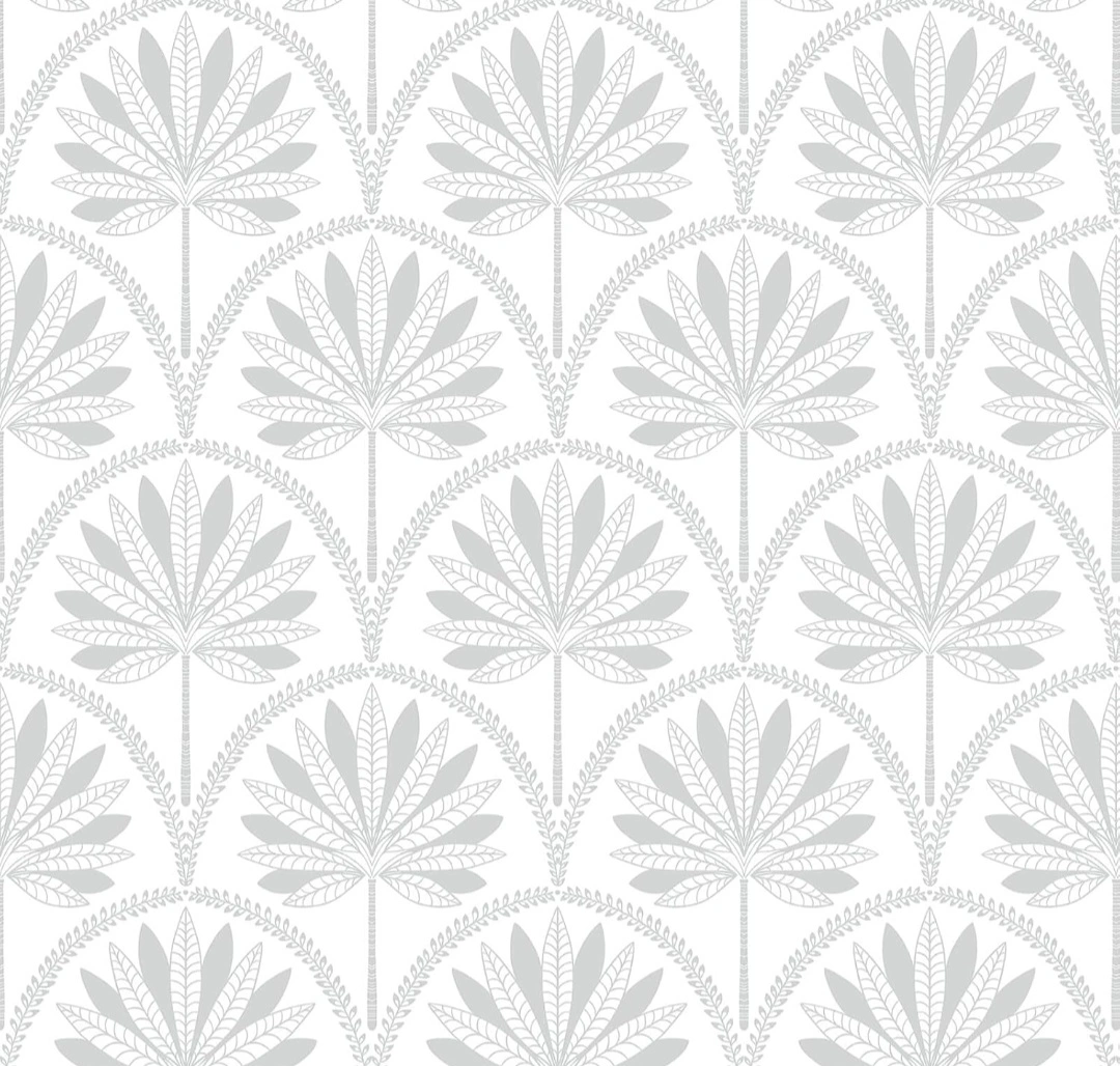 Spruce up your space with this stylish removable wallpaper! Featuring a silver and white palm leaf pattern, it's easy to cut and apply.
