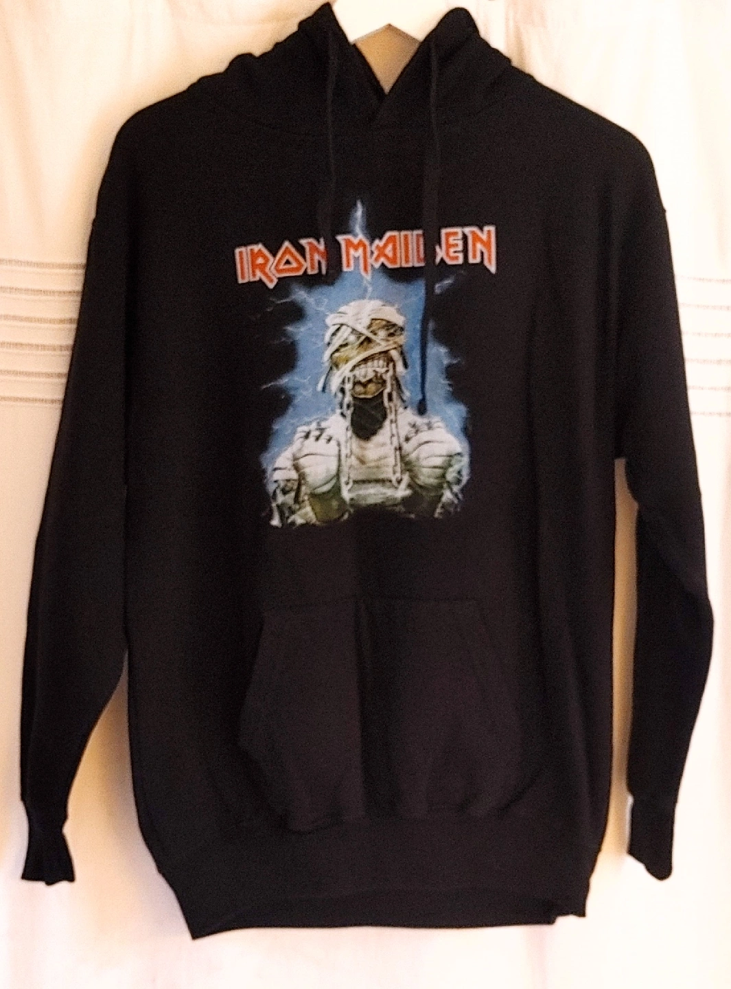 Men's black Iron Maiden hoodie in size M. The hoodie features a graphic print of the band's mascot, Eddie. Ribbed cuffs and hem with pull strings on the hood. Good condition. No rips or stains. Smoke free home pick up Mt.Brydges cash only.