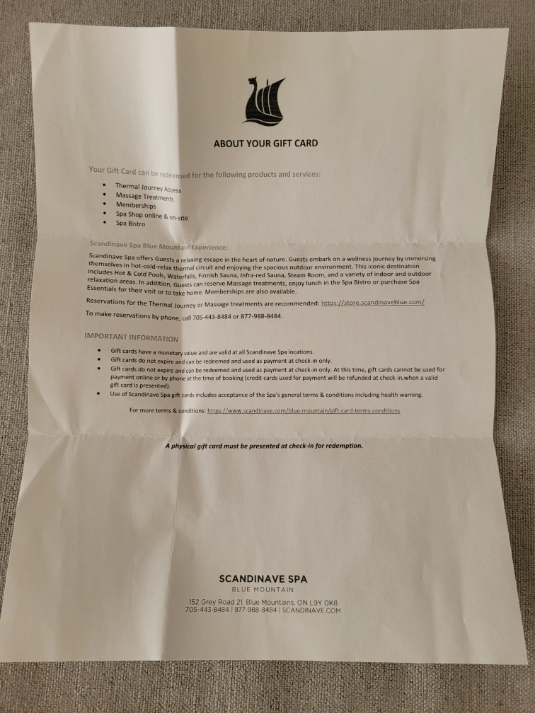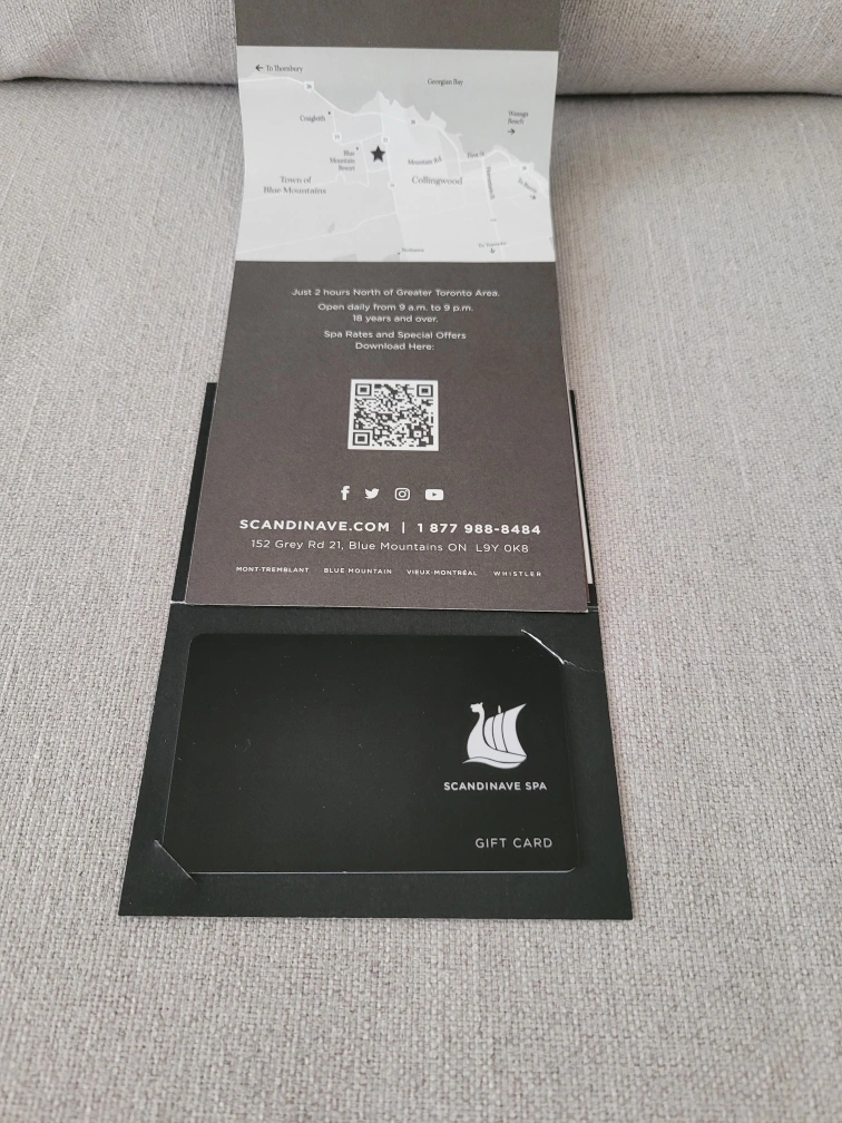 281Selling a $300 gift card for Scandinave Spa Blue Mountain. It was a gift. This gift card can be redeemed for Thermal Journey Access, Massage Treatments, Memberships, and Spa Shop online & on-site or Spa Bistro. A physical gift card must be presented at check-in for redemption.