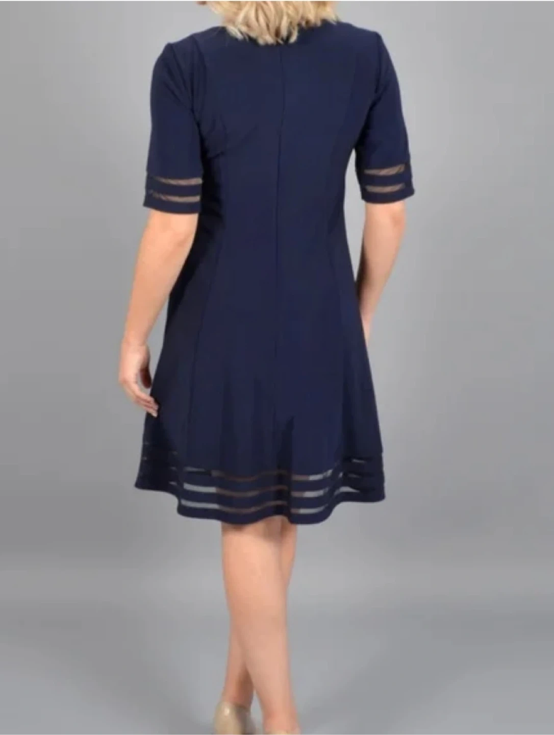 Selling a lovely Laura dress in size 8! It's a beautiful navy blue colour, perfect for any occasion. The dress features short sleeves with sheer detailing and a flattering A-line silhouette. It's in great condition and ready for a new home