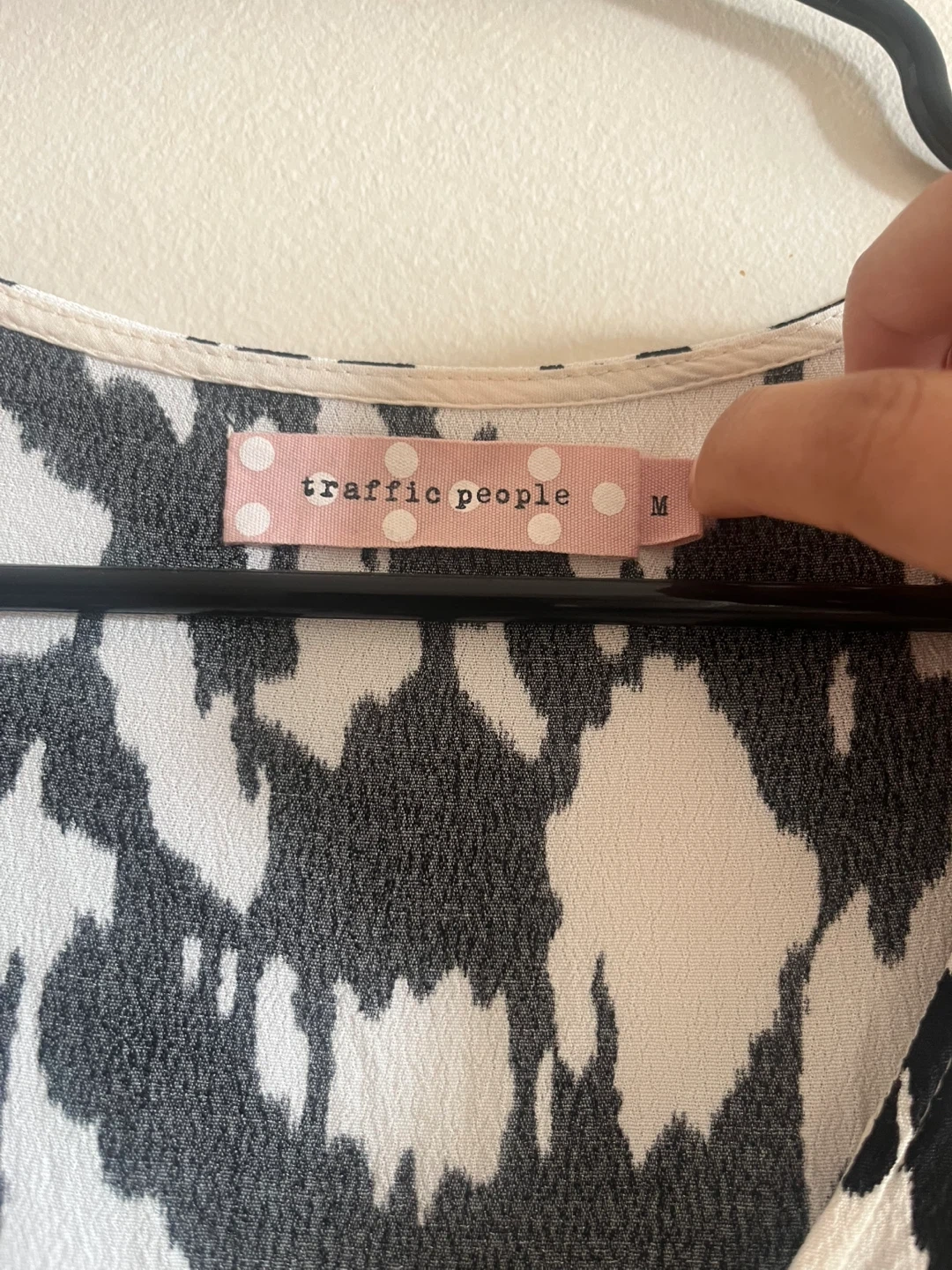 stylish wrap dress from Traffic People. It features a unique black and white pattern and a flattering wrap design. Perfect for any occasion. Size medium