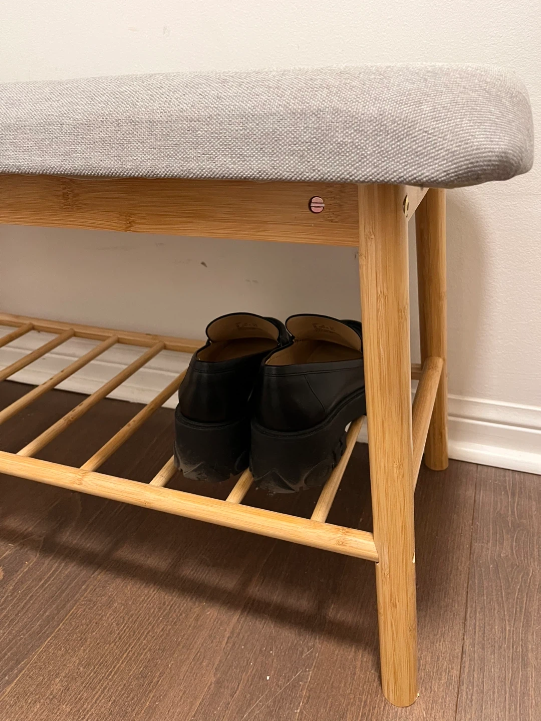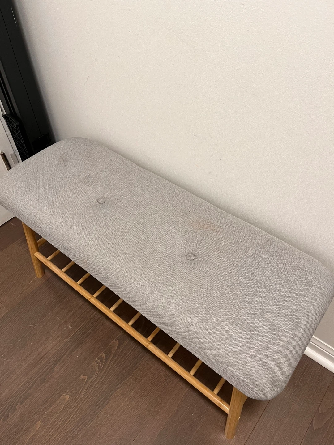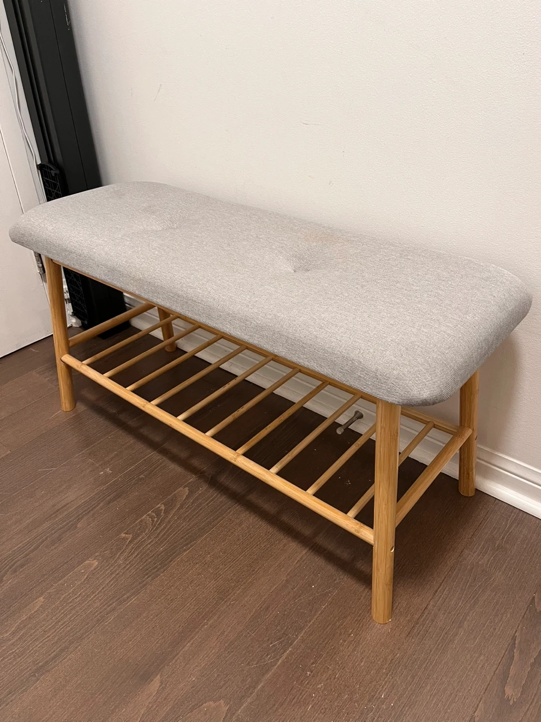 256Selling a handy upholstered bench with a built-in shoe rack. It's perfect for entryways or bedrooms. The bench provides a comfy spot to sit while putting on shoes, and the rack keeps your footwear organized and out of the way.