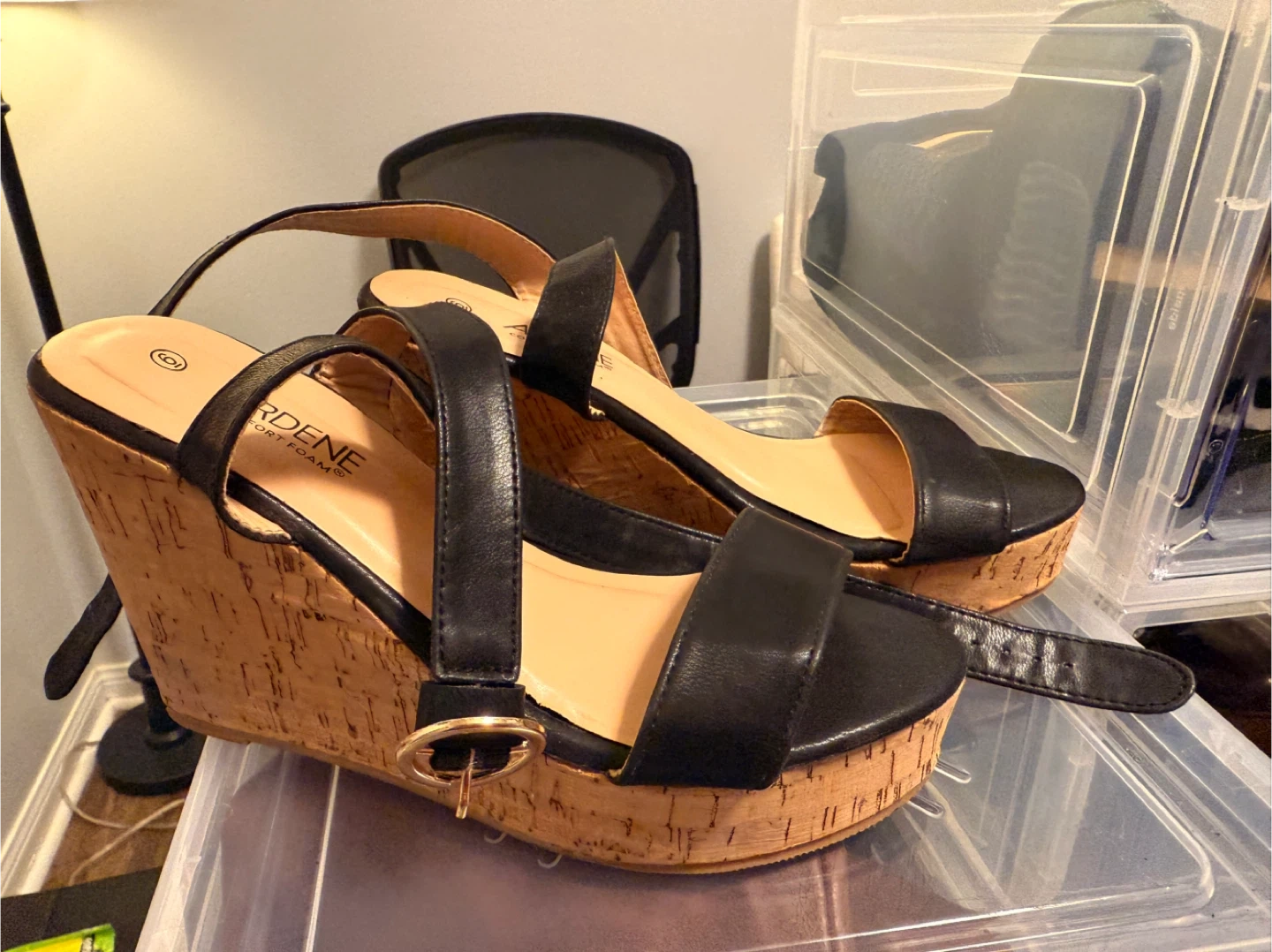 Cute Ardene wedge sandals in a size 6. They have a cork-style wedge and black straps. Perfect for summer!used gently