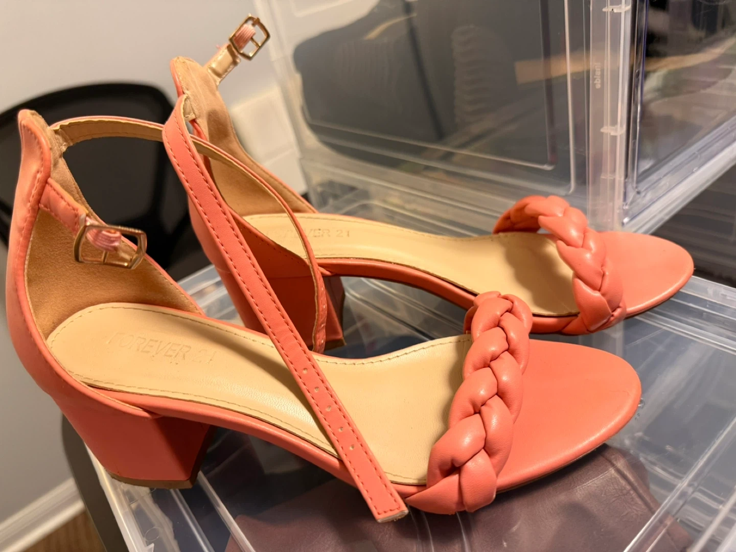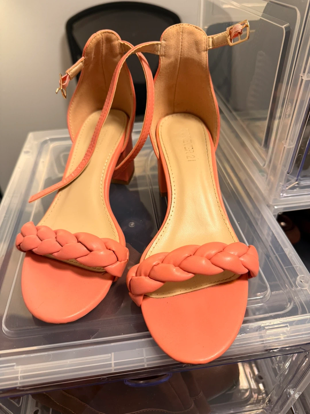 Cute Forever 21 heels in a coral colour! They feature a braided detail across the toes and an adjustable ankle strap. Size 6 or 7.used gently.