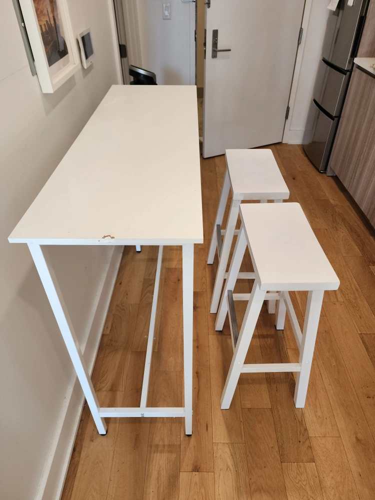 Selling a white bar table with two matching stools. The set is in good condition and perfect for a small dining area or kitchen. Great for apartments or smaller spaces