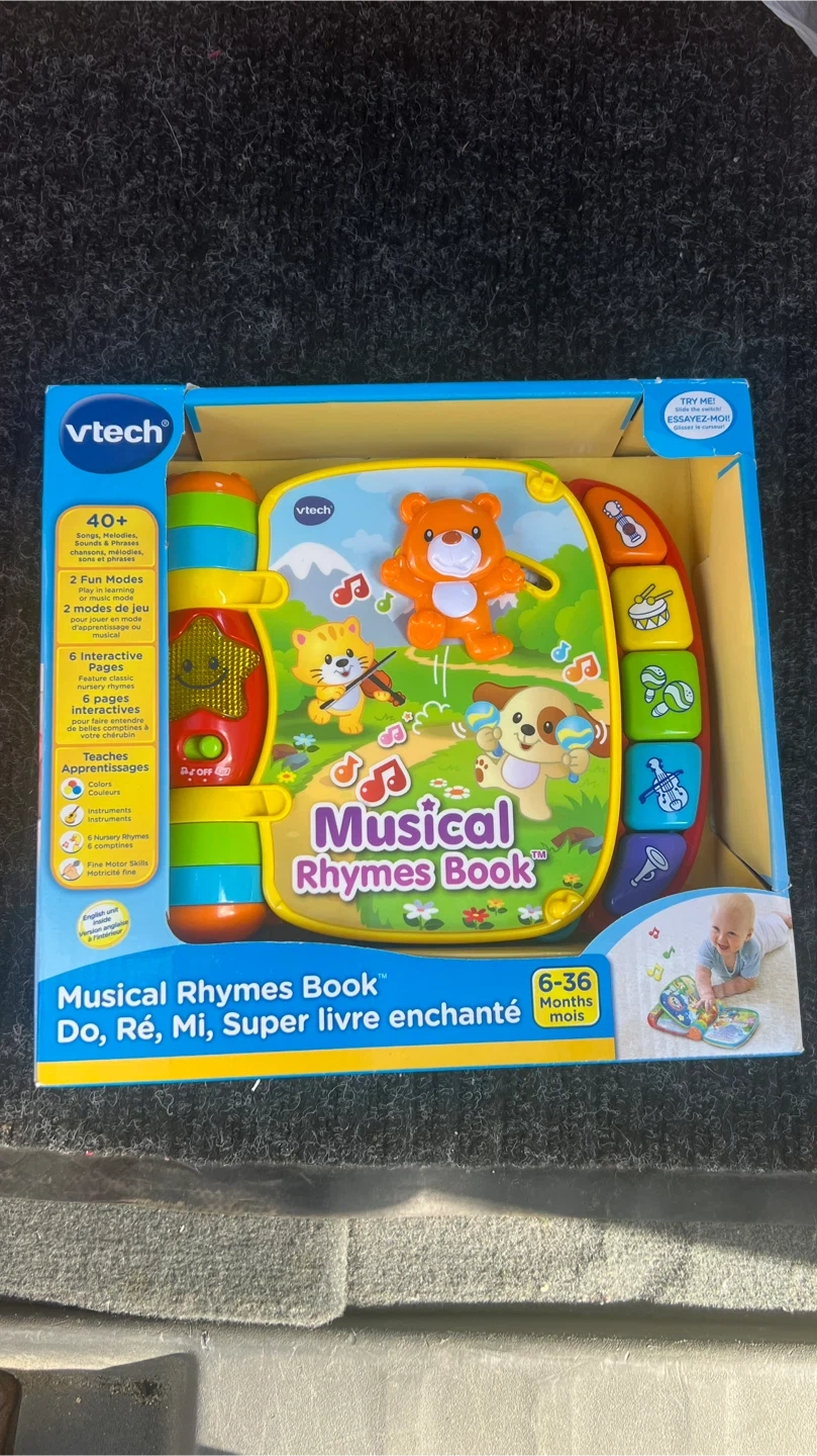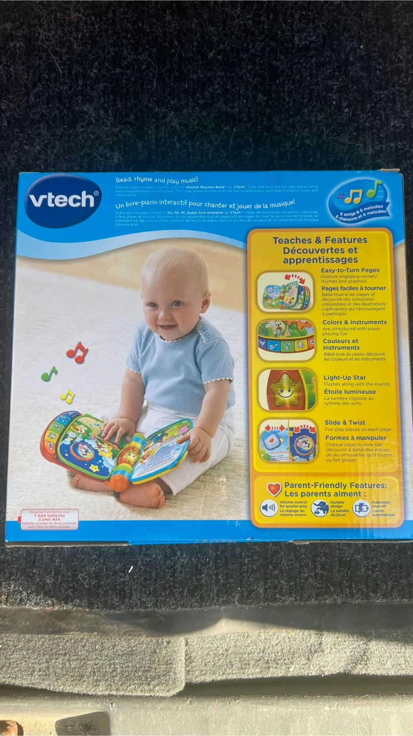 The VTech Musical Rhymes Book is perfect for little ones aged 6-36 months! It features easy-to-turn pages with rhymes and graphics. Your baby can discover instruments, colours, and sounds. It also has a light-up star and a slide and twist piece to help your baby develop fine motor skills. It requires 3 AAA batteries, which are included