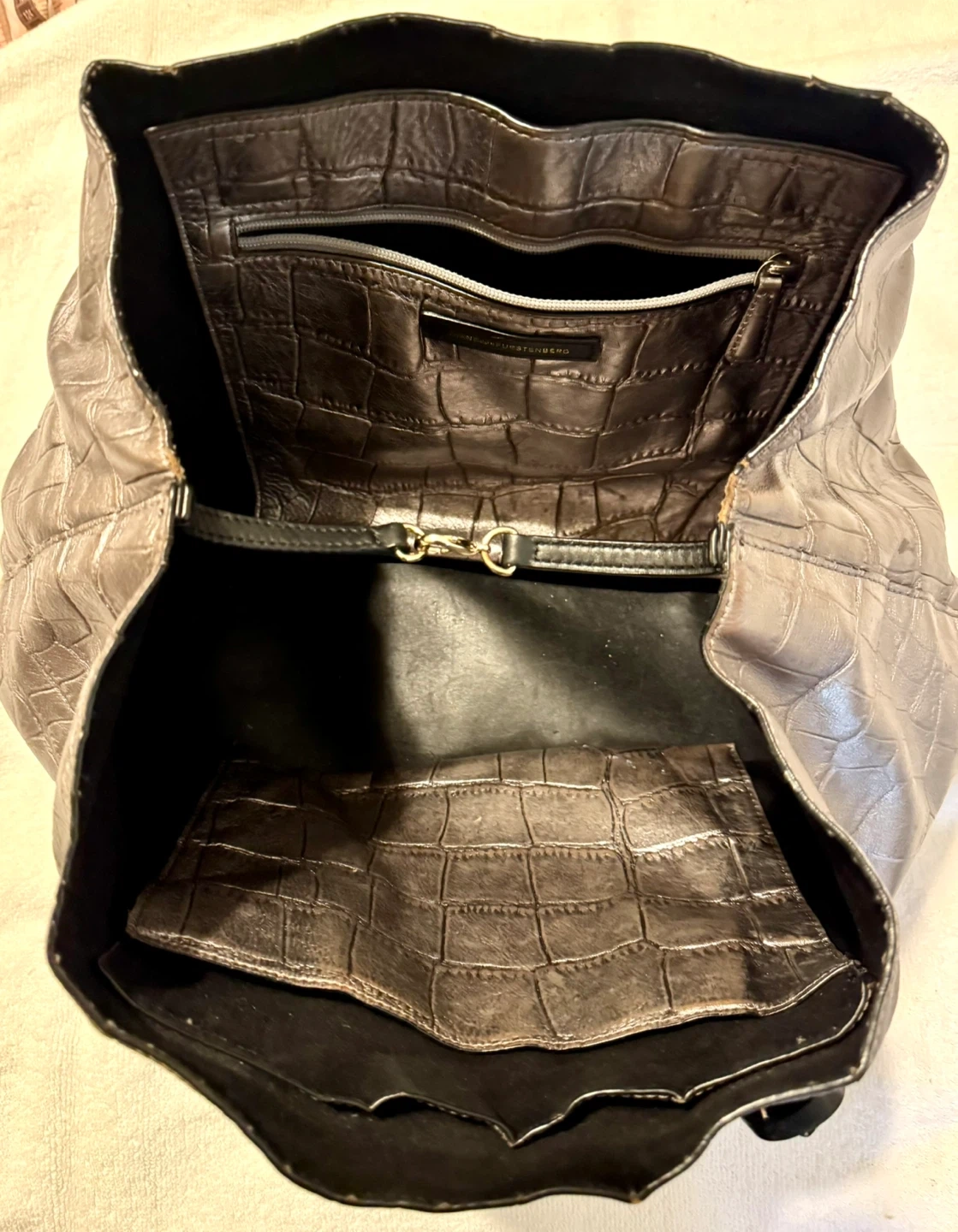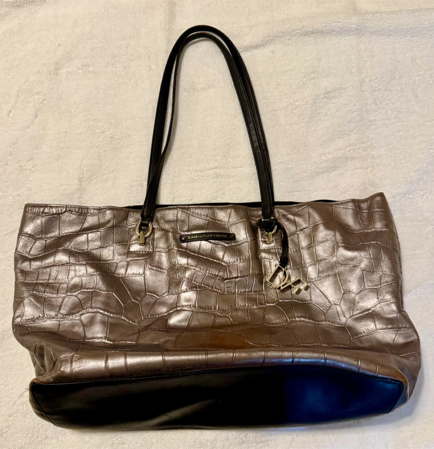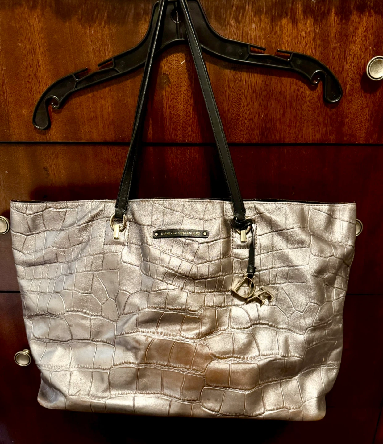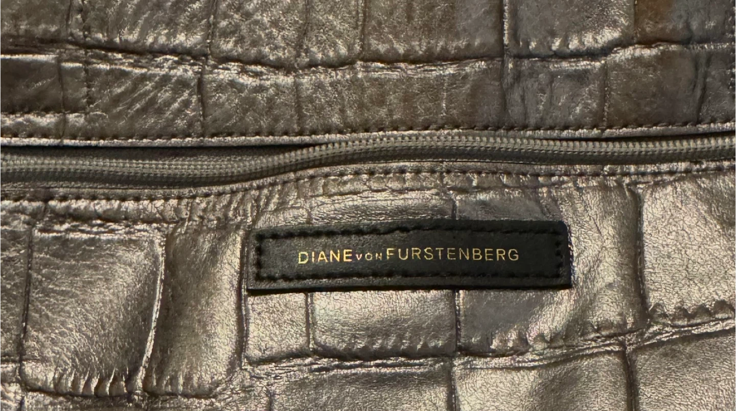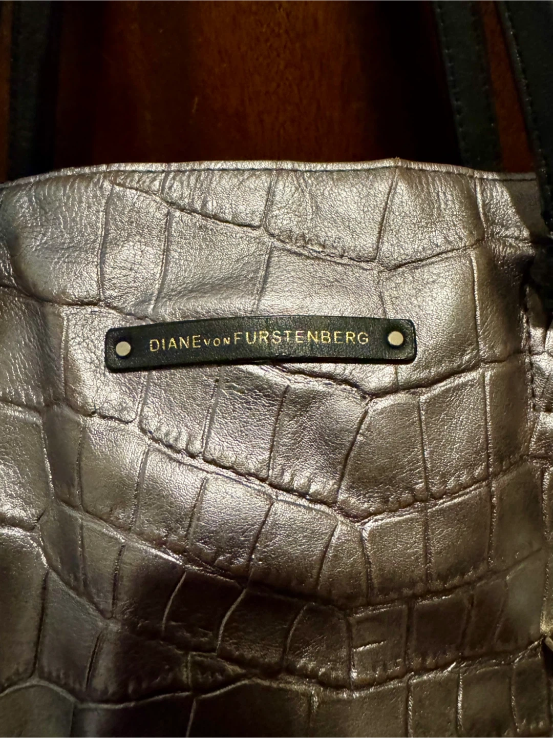 Elevate your style with the Diane Von Furstenberg Silver Croc-Embossed Tote Bag. Croc-embossed leather lends a glam look to this flared DVF tote. Recessed zip top closure opens to a lined, 5-pocket interior. Thin, flat double handles. Leather: Cowhide