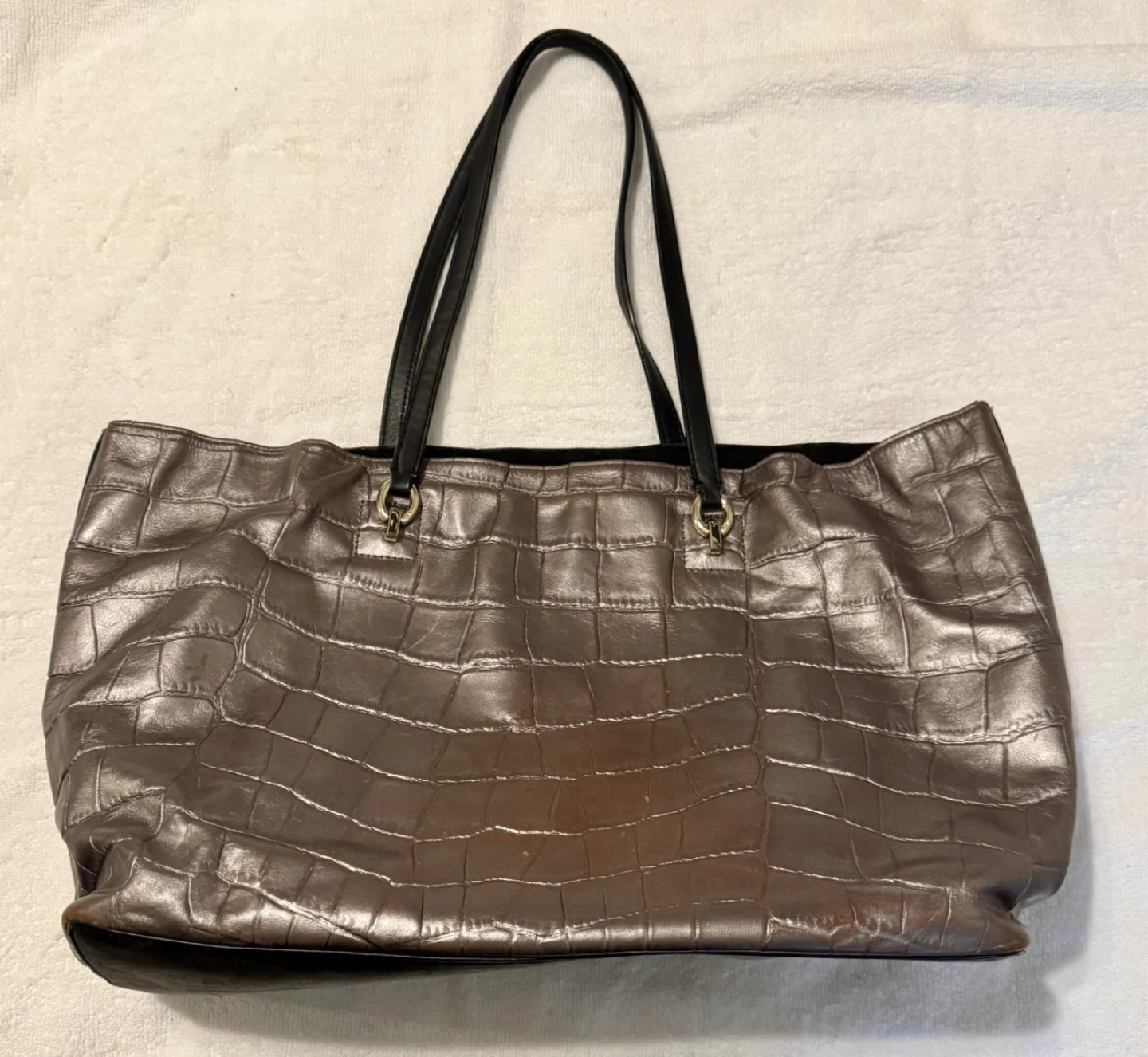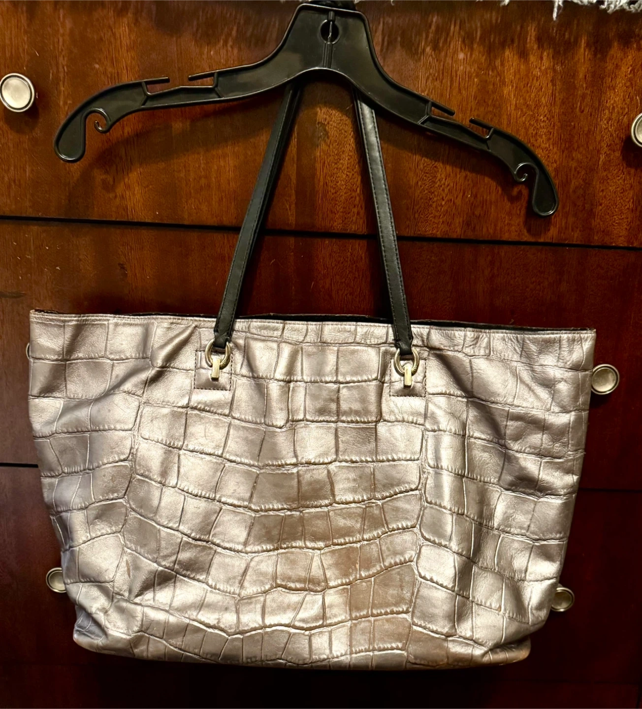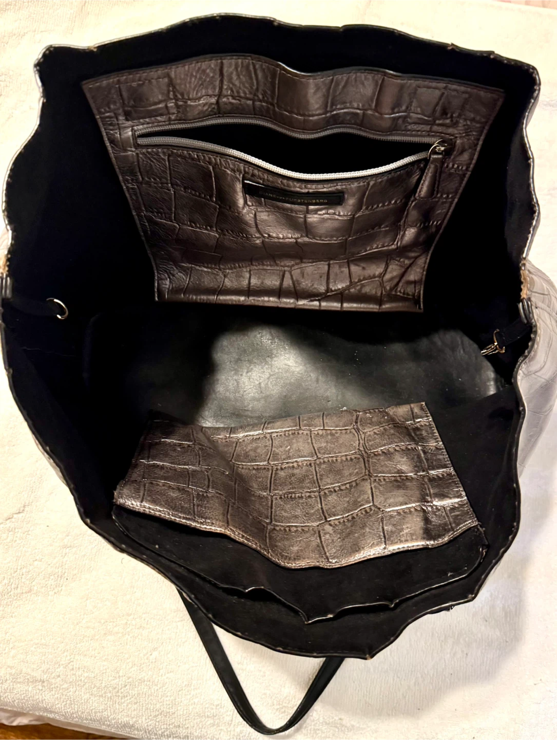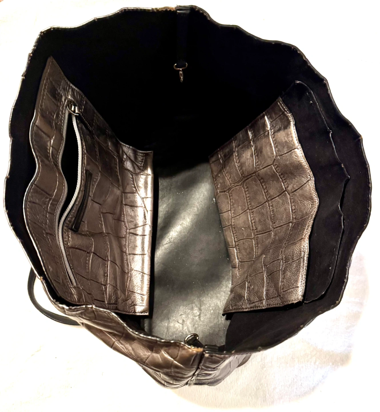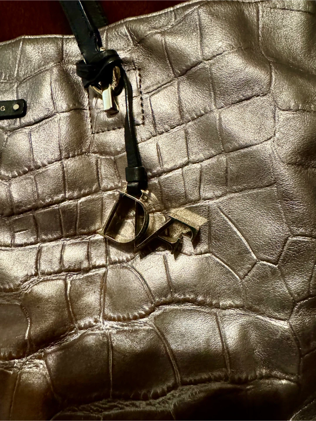 Elevate your style with the Diane Von Furstenberg Silver Croc-Embossed Tote Bag. Croc-embossed leather lends a glam look to this flared DVF tote. Recessed zip top closure opens to a lined, 5-pocket interior. Thin, flat double handles. Leather: Cowhide