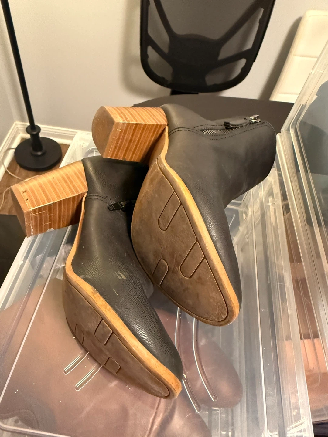 Selling a pair of Naturalizer black leather ankle boots. They are a size 7 and feature a stylish wooden heel. Great for adding a bit of height and style to any outfit! Used. AS-IS.