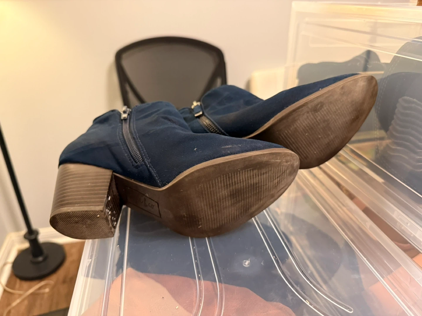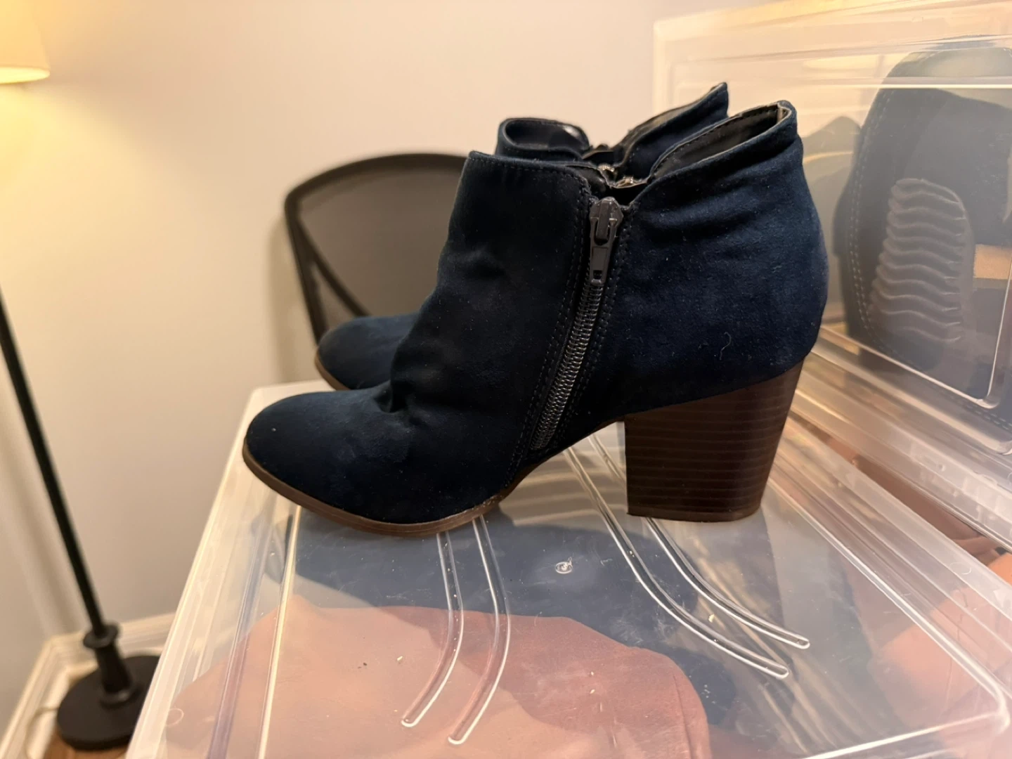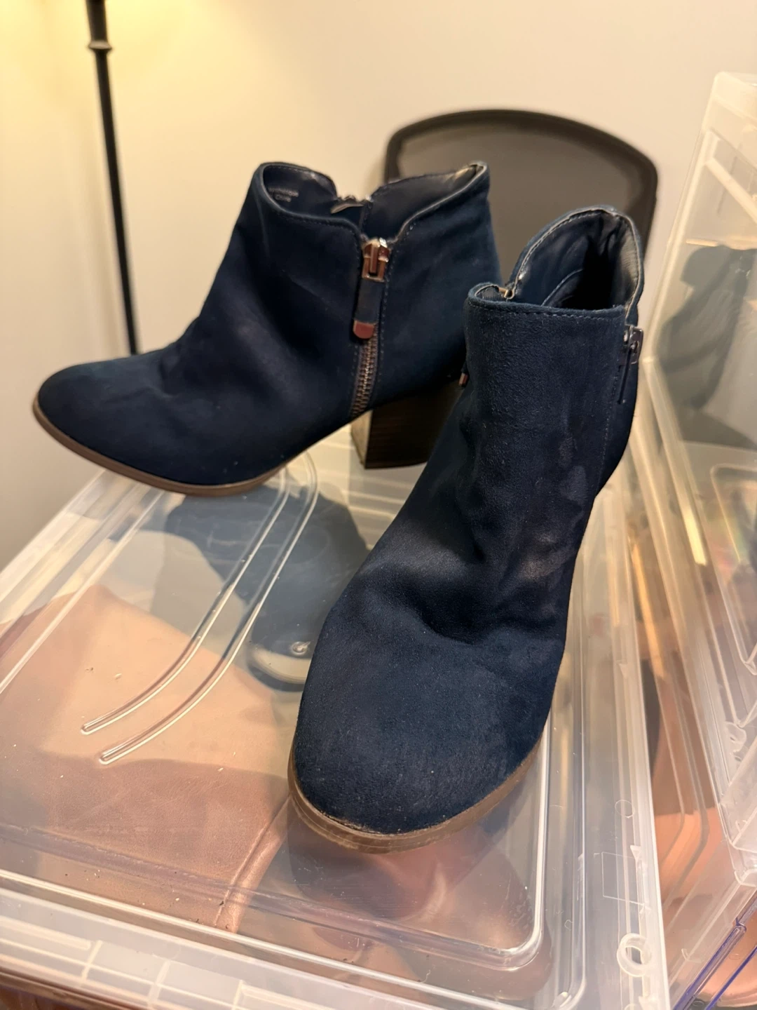 Selling a pair of Aria ankle boots in a lovely navy blue colour. They feature a stylish heel and a convenient zipper closure. Perfect for adding a touch of elegance to any outfit! Used AS-IS.