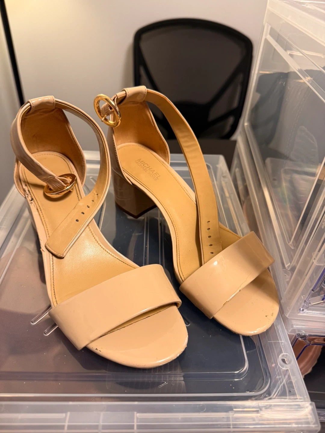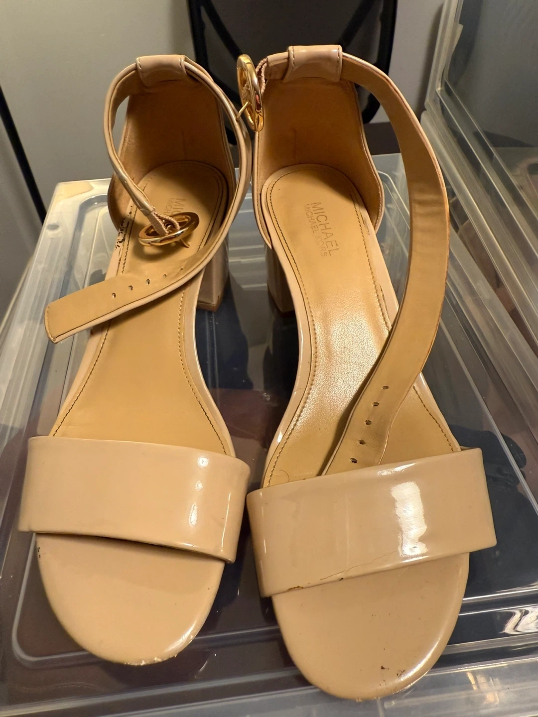 These Michael Kors sandals are a stylish addition to any wardrobe! They feature a comfortable block heel and a chic nude colour. Perfect for dressing up or down, these sandals are a size 6 or 7and ready for a new home used gently once. AS-IS.