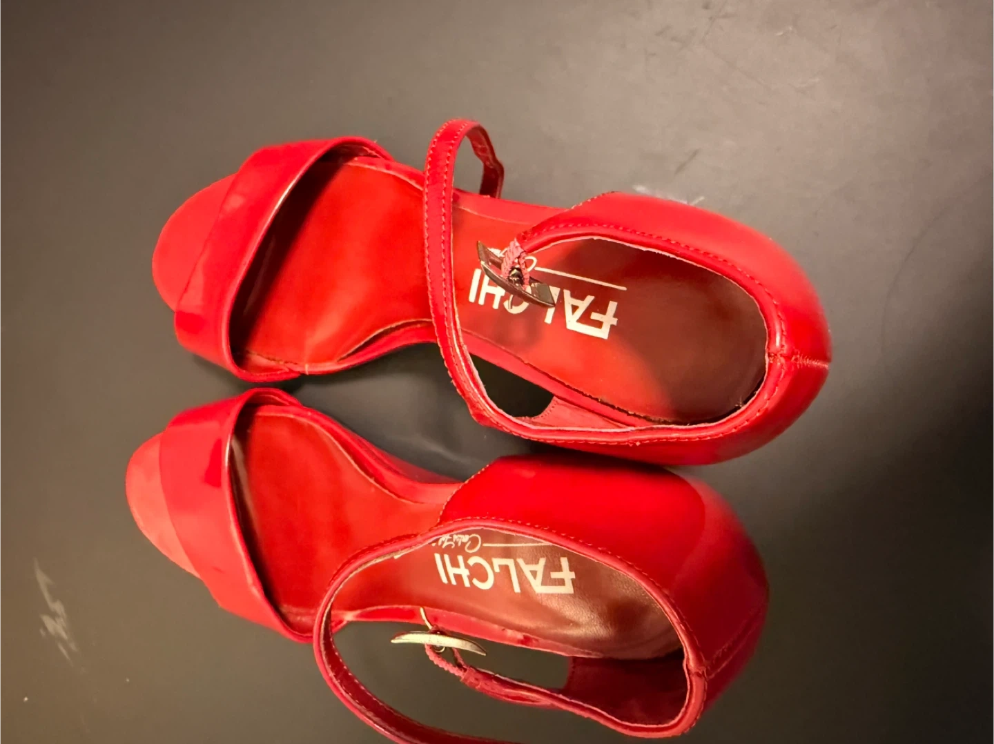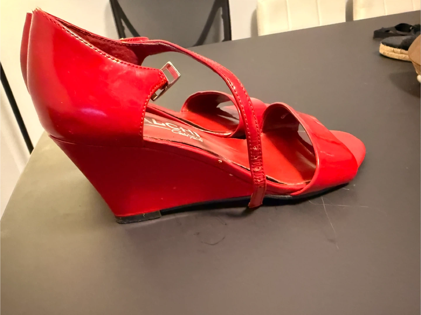 These are a pair of Falchi red wedge heels. They have an ankle strap and are in good condition. Perfect for adding a pop of colour to your outfit! Used gently AS-IS.