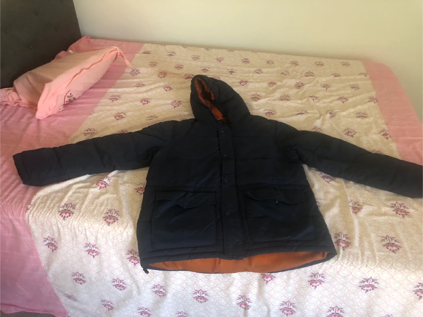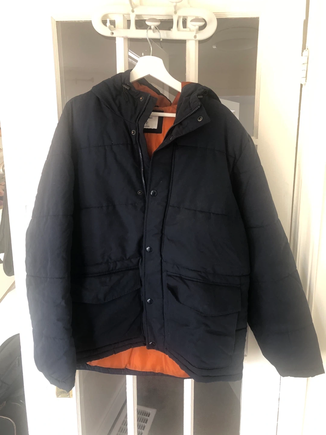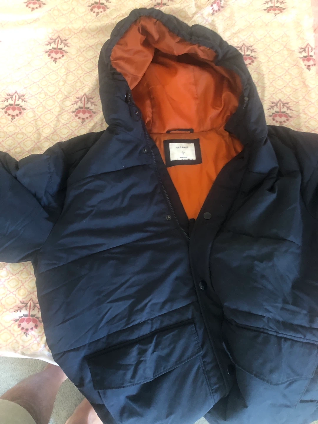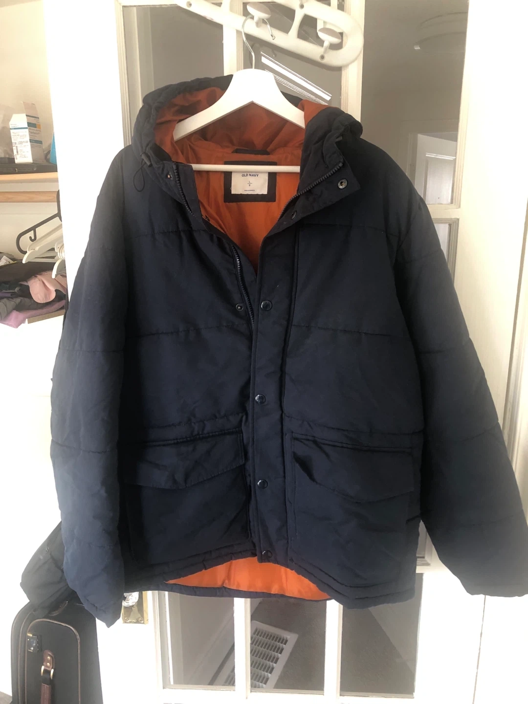 I'm selling a navy blue winter jacket from Old Navy. It's a size large and has an orange lining. Perfect for the cold weather!