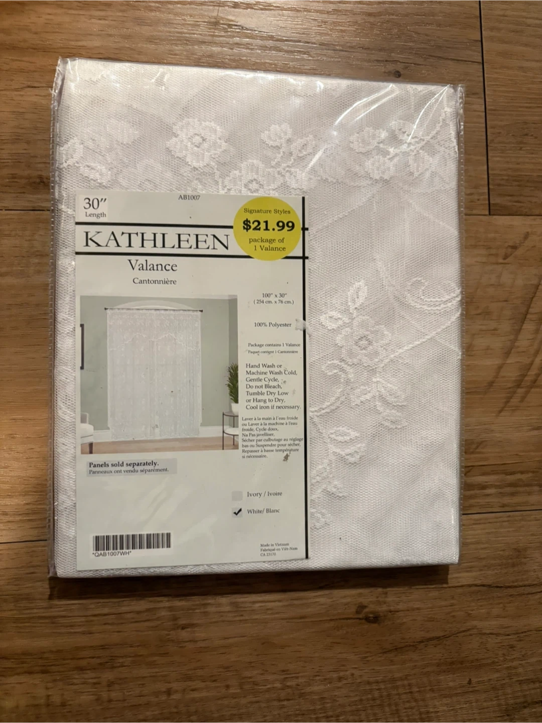 Selling a Kathleen valance in white lace. It's 30 inches in length and 100 inches wide.