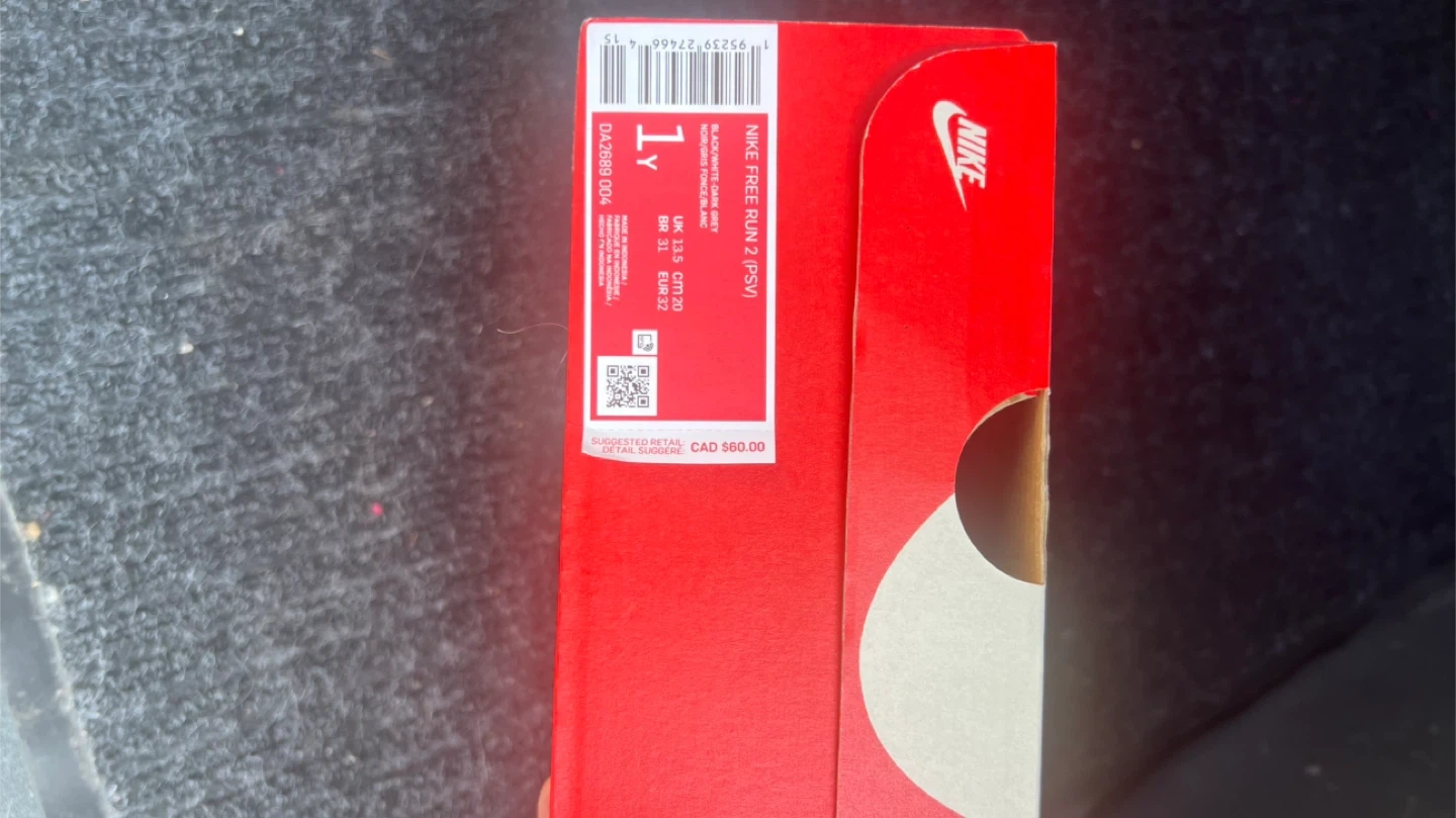 Selling a pair of Nike Free Run 2 (PSV) kids sneakers in black and white. They are a size 1Y. The box is included. Originally retailed for CAD $60
