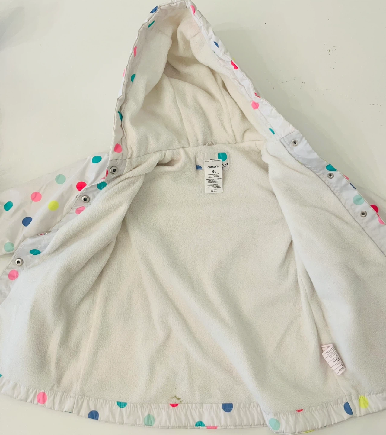 80Keep your little one dry and stylish with this adorable Carter's raincoat! It features a fun polka dot pattern and a cozy fleece lining to keep them warm on those drizzly days. The size is 3T, perfect for toddlers!