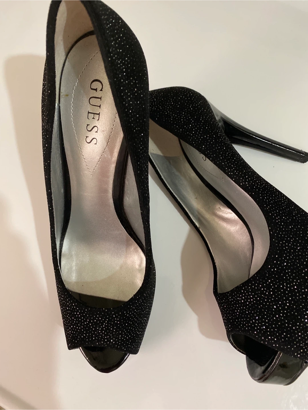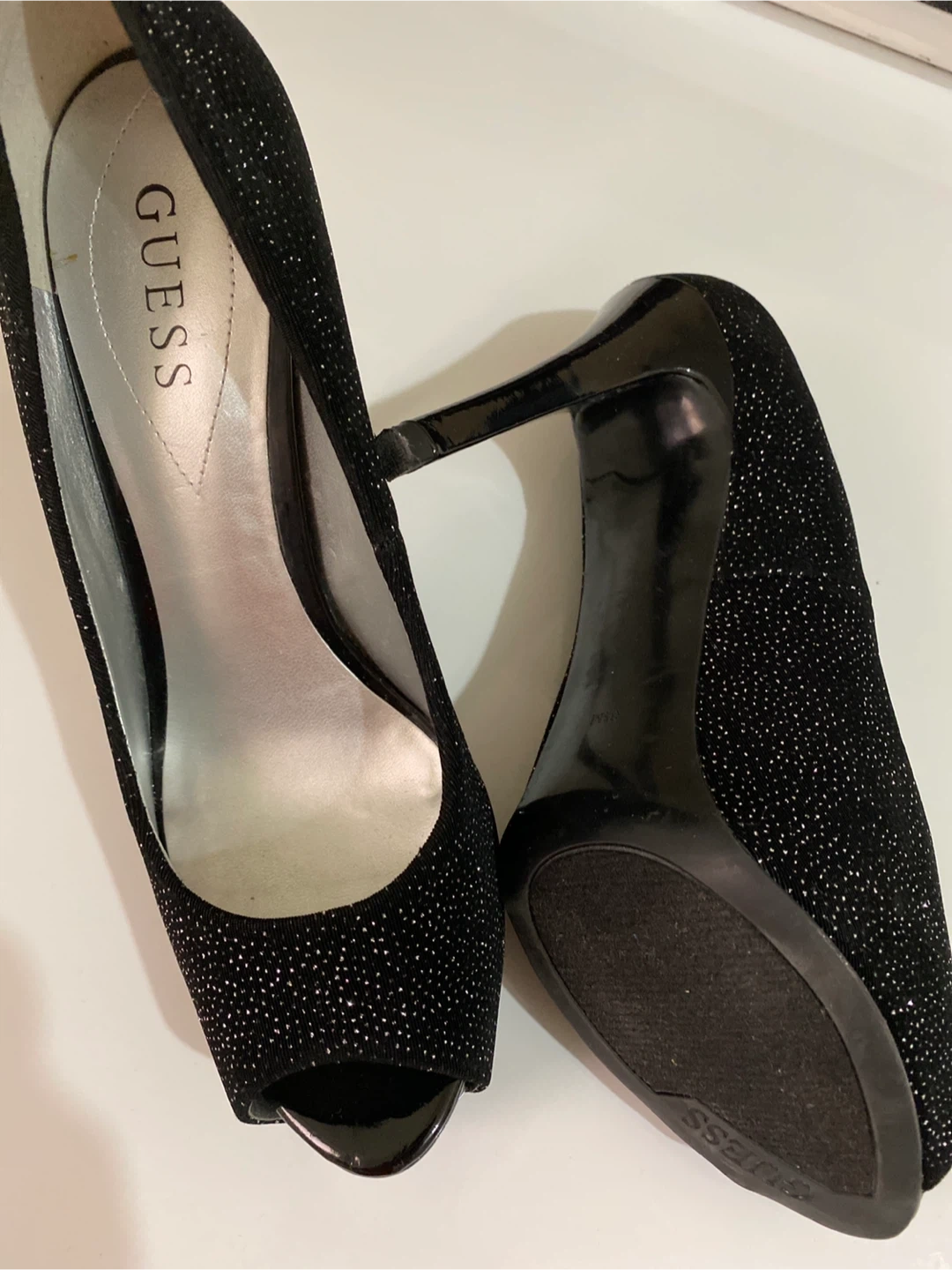18Selling a pair of Guess black sparkly heels in size 8.5 M. These stylish heels are perfect for a night out or any special occasion. They have a sleek design and are new!