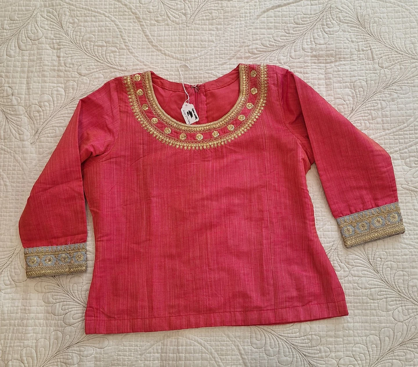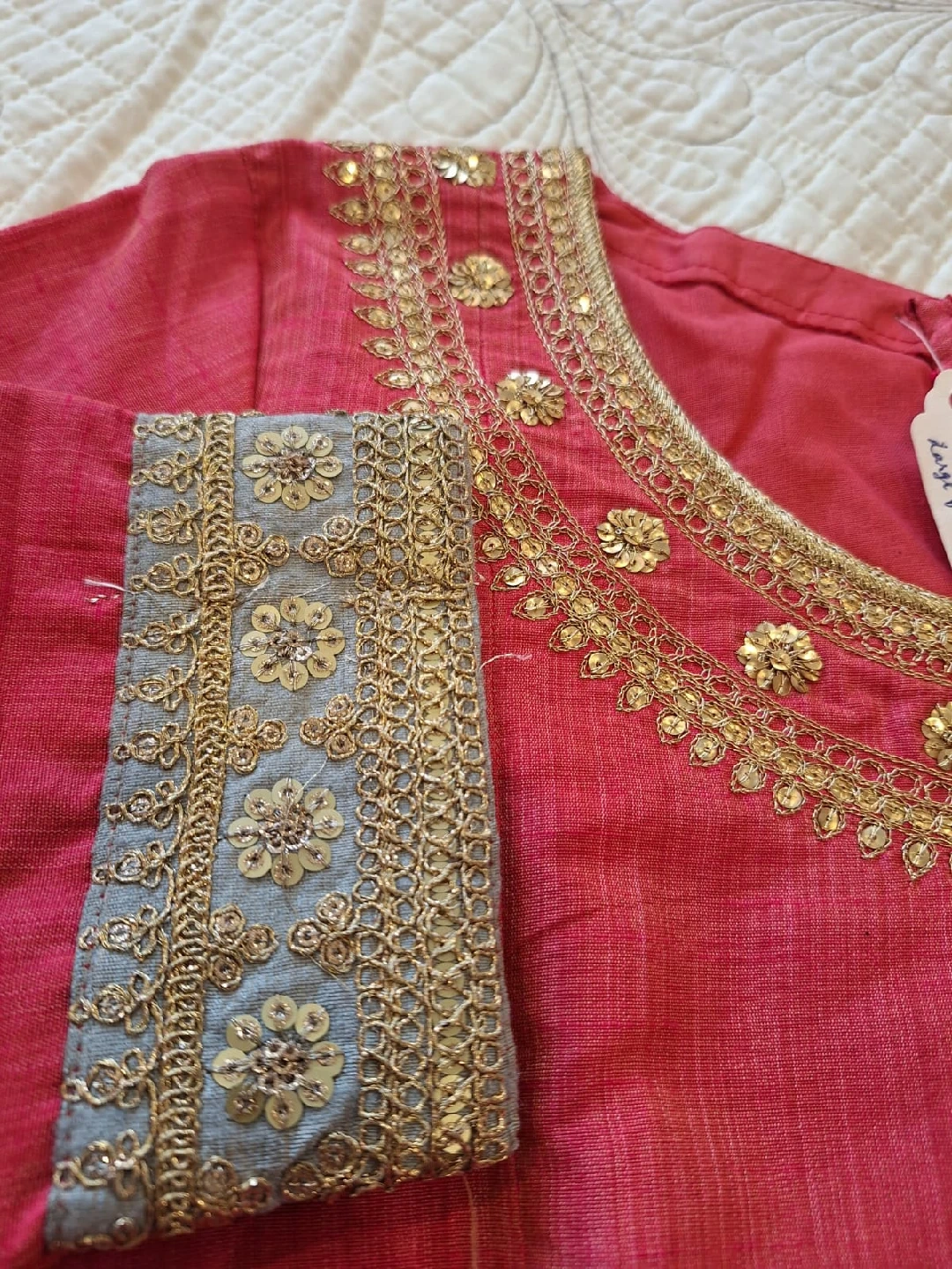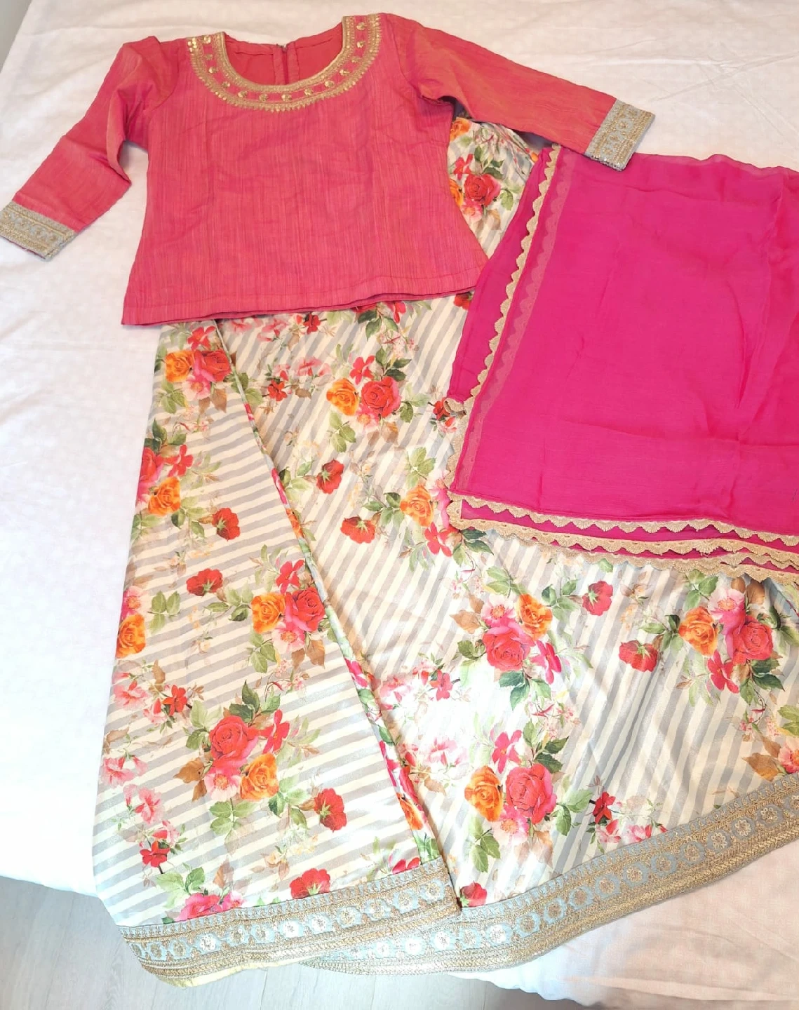 Absolutely beautiful floral 3 piece Lehenga set. Satin like material ensures the dress stays wrinkle free and drapes well. Good quality gold embroidery and lining. The top has a long zipper on the back to ensure good fit! All in all, this will add glamor to your function!