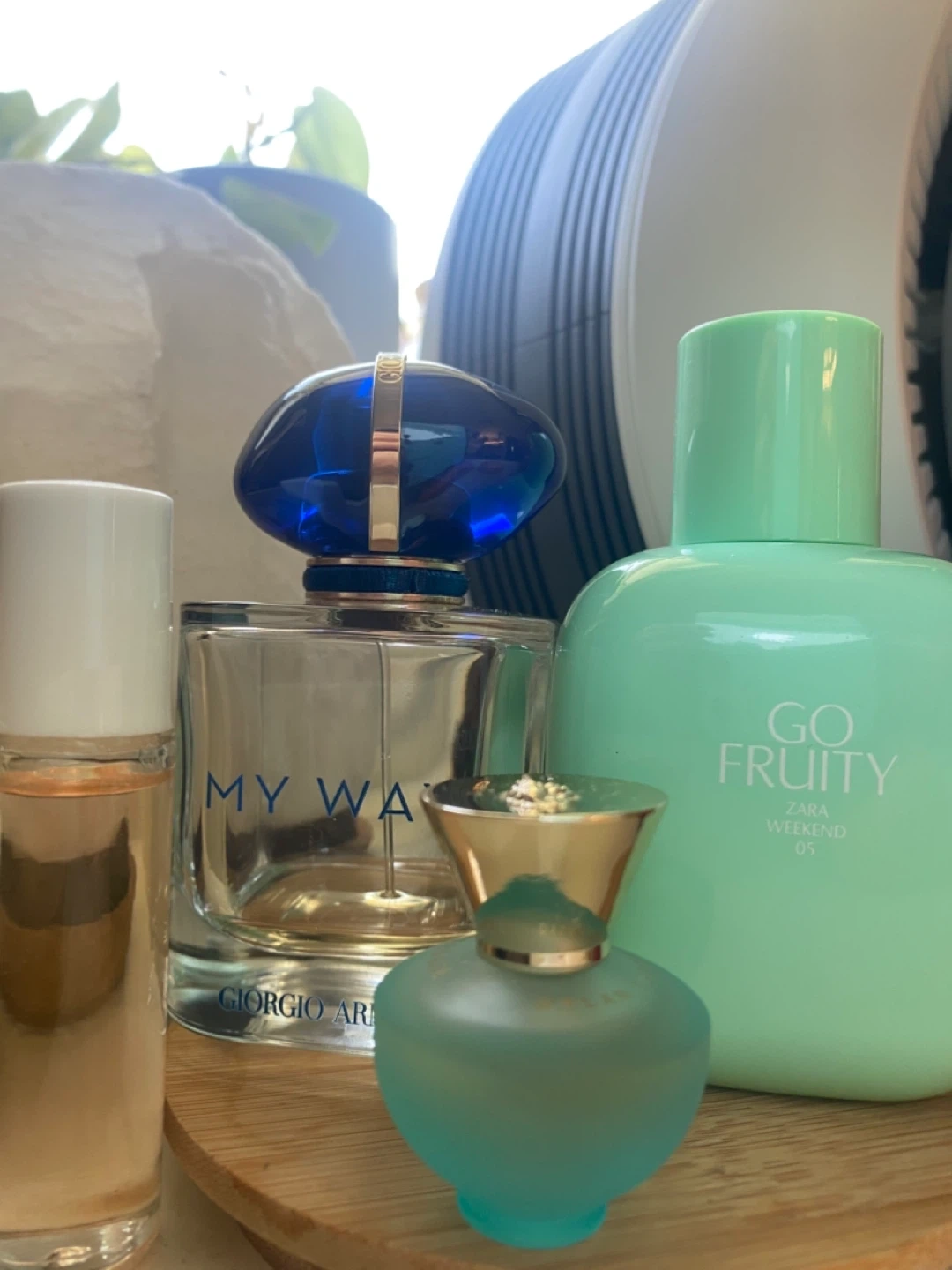 From left to right: 1) roll-on perfume oil (made from all natural oils—was named “Rihanna 2.0” 2) Giorgio Armani My Way EDP 50 ml— ~10 ml left in the bottle 3) Versace Dylan Turquoise EDT 5 ml 4) Zara Go Fruity EDT 100 ml— ~70% full ** will include several fragrance freebies. Will happily send photos upon request **