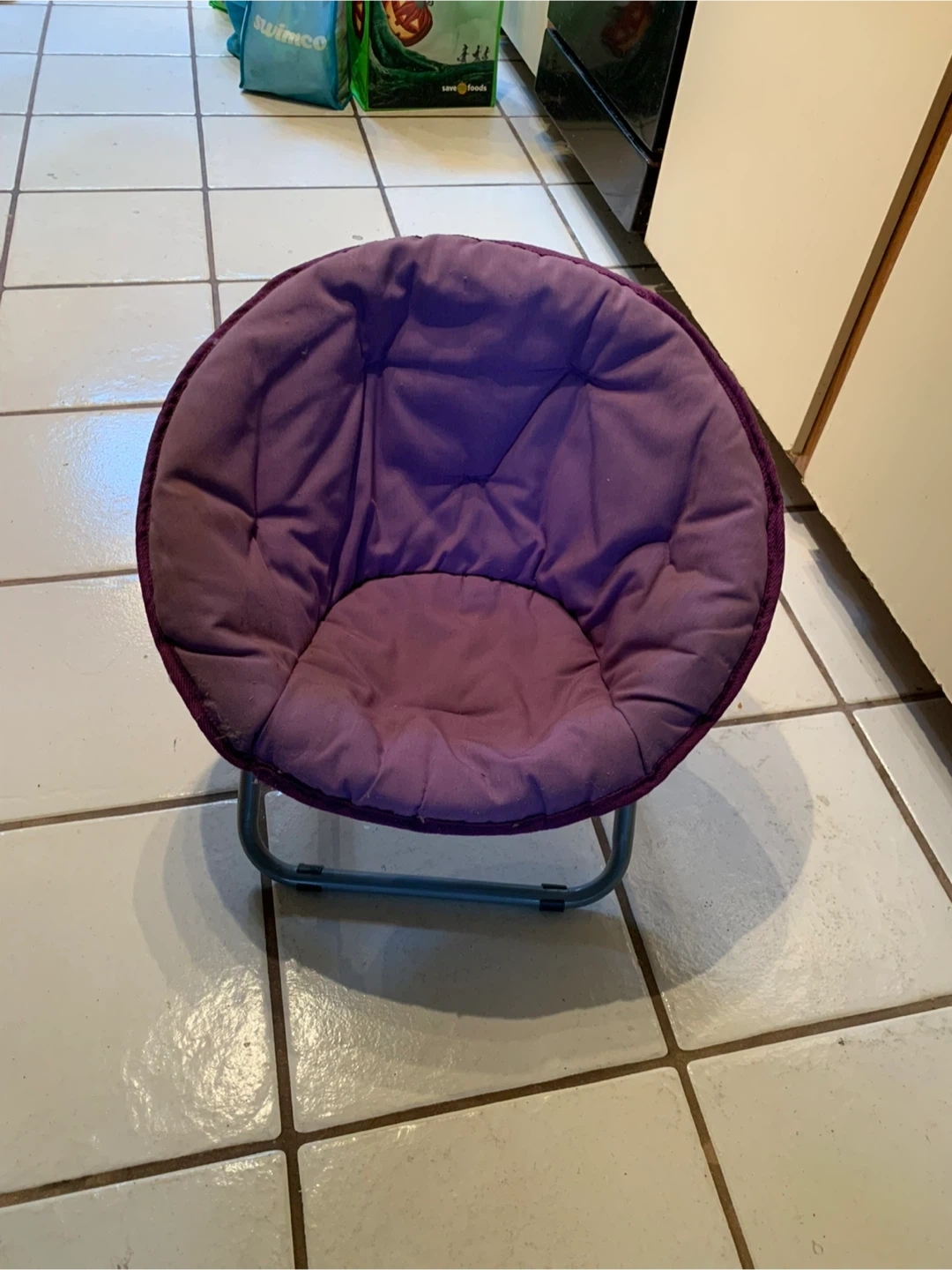 Free to a good home - toddler saucer / lounge chair. Has lived through a spill or two but otherwise in great shape. Lightweight, folds up, and easy to move around. Approximately 18 inches at its tallest point.