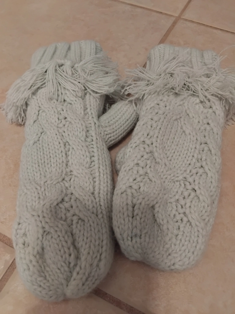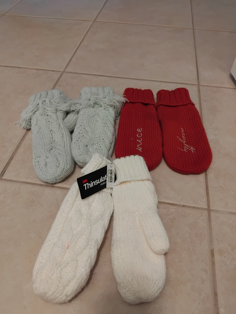 I have a few pairs of knitted mittens for sale! There's a red pair with 'nice' and 'naughty' embroidered on them, a grey pair with a cute fringe, and a white pair with a 3M Thinsulate tag still attached. They're perfect for keeping your hands warm and cozy during the colder month