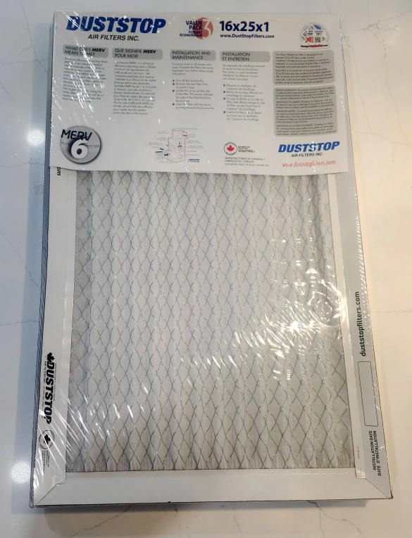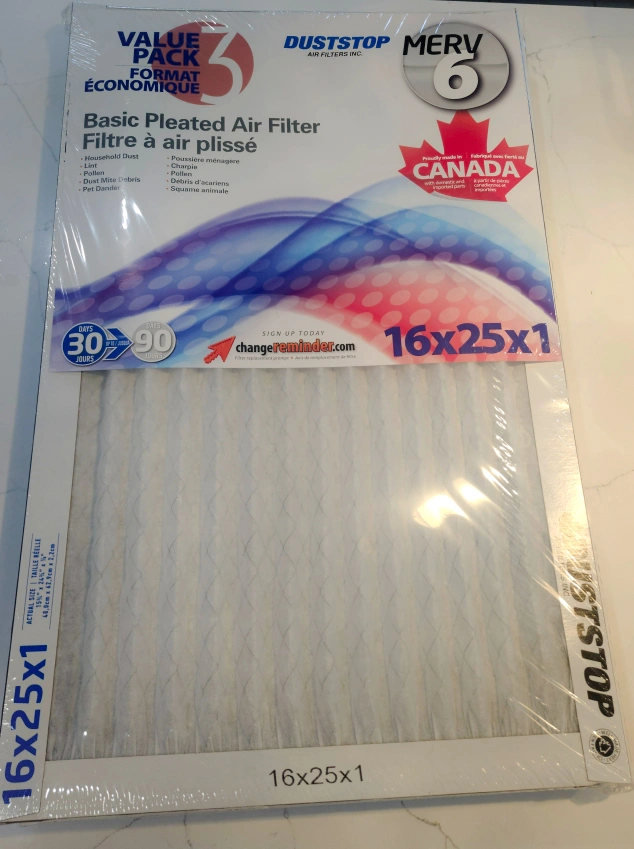 I'm selling a new Duststop basic pleated air filter in the 16x25x1 size. It's a MERV 6 filter, still in package. They're perfect for household dust, lint, and dust mite debris. It's made in Canada!