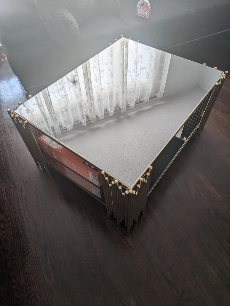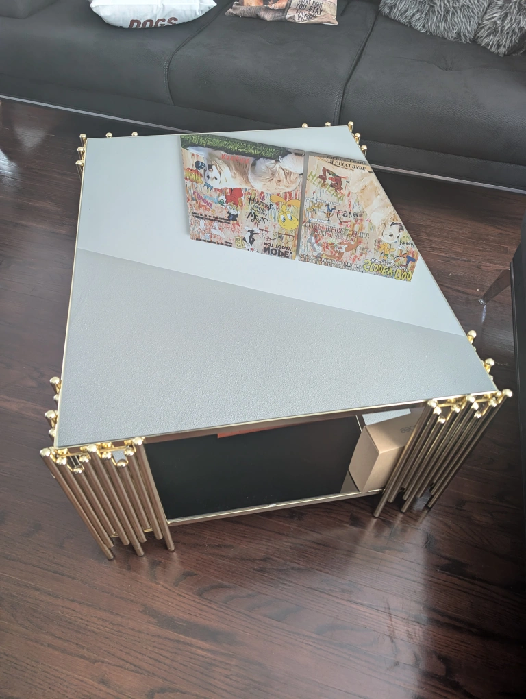Selling a stylish center piece table with a mirrored top and bottom and gold accents. It's in great condition and would look lovely in any living room! The unique design features a geometric pattern and a lower glass shelf for storage