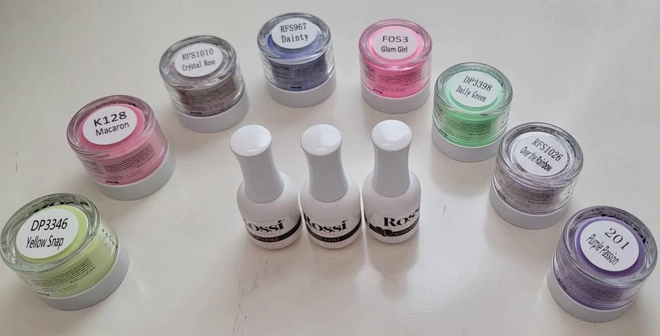 Dip Powders are all new, never used, are still sealed, see pics. Please note: the Activator, Base Coat and Top coat are used, I used the 3 items twice with other powders. If wanted, I have my old lamp that I don't need but still works. FYI: you do not need a lamp for powder applications.