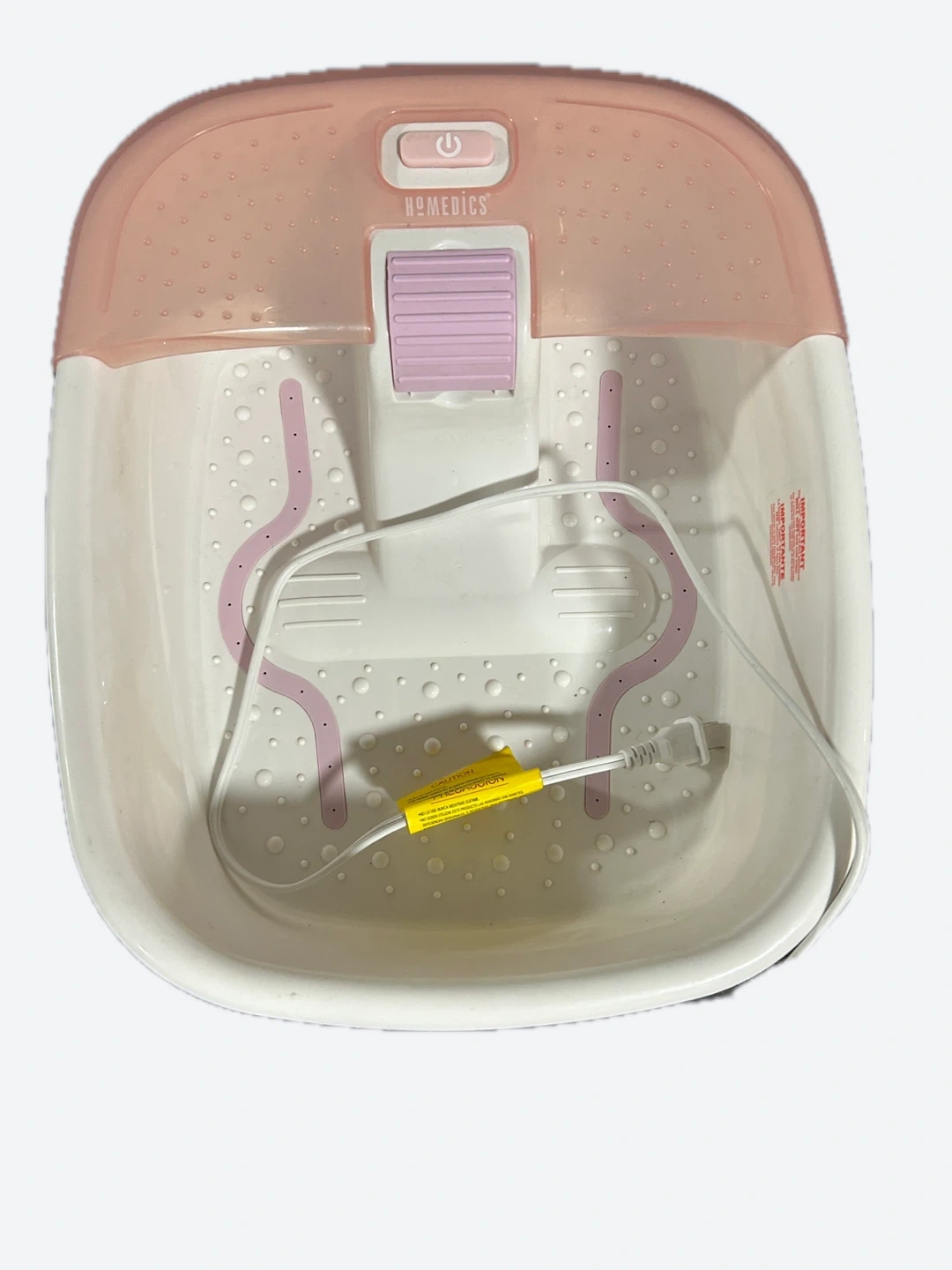 Selling a HoMedics foot spa! It's in great condition and ready to help you relax after a long day. It's white with pink accents and features a power button and a control switch