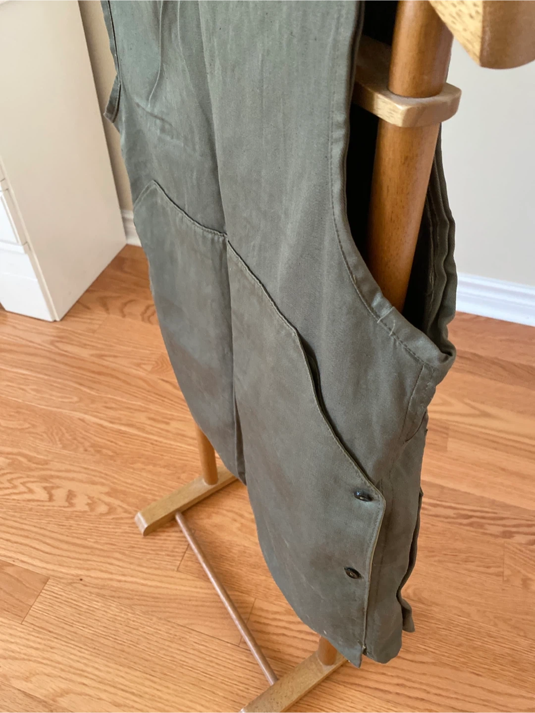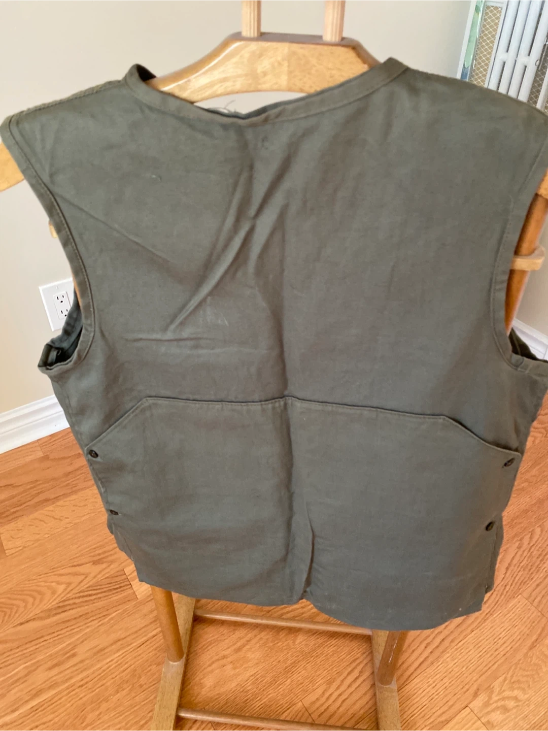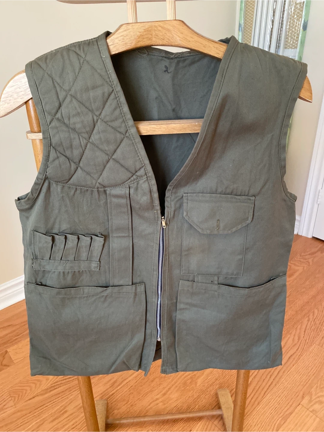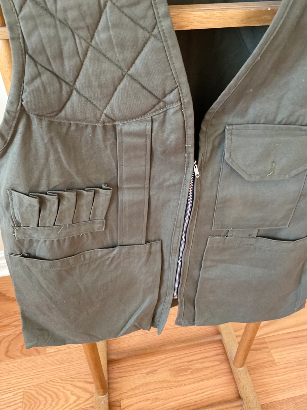 Selling a gently used olive green shooting vest. It features a quilted shoulder pad and multiple pockets on the front and back. Perfect for outdoor activities or as a stylish layering piece!