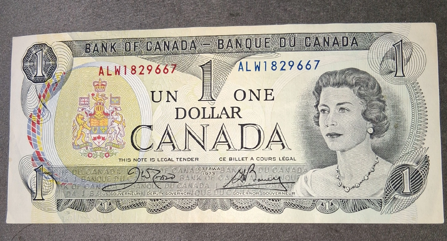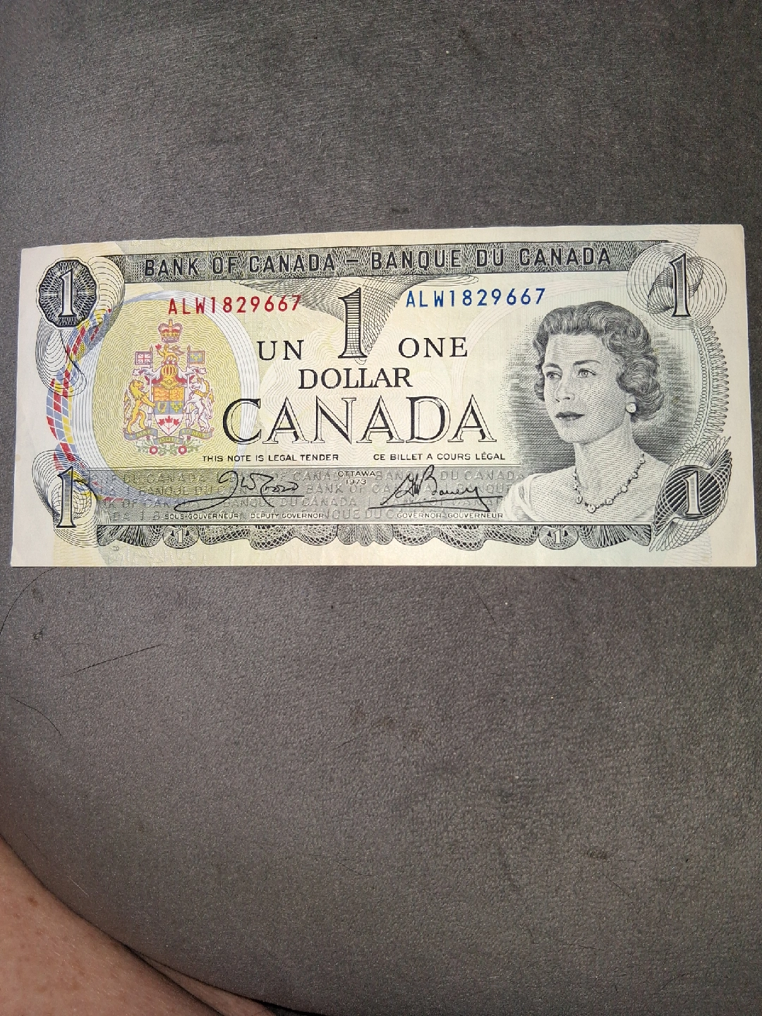 Selling a collection of vintage Canadian one-dollar bills from 1973! These bills feature Queen Elizabeth II and are a piece of Canadian history. Great for collectors or anyone interested in numismatics! They are uncirculated bills in sequential order for 4 (135$ for all four or 35$ each) and one single bill (35$). All are part of a collection from a former bank employee. Prices start at 35$ for a single bill.