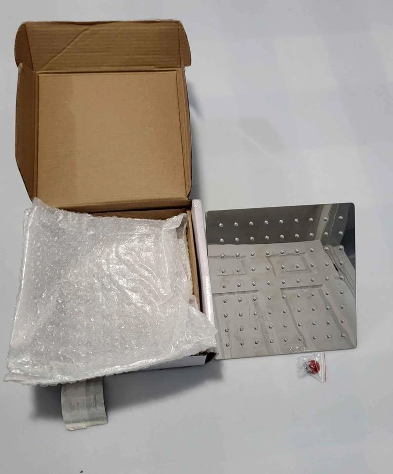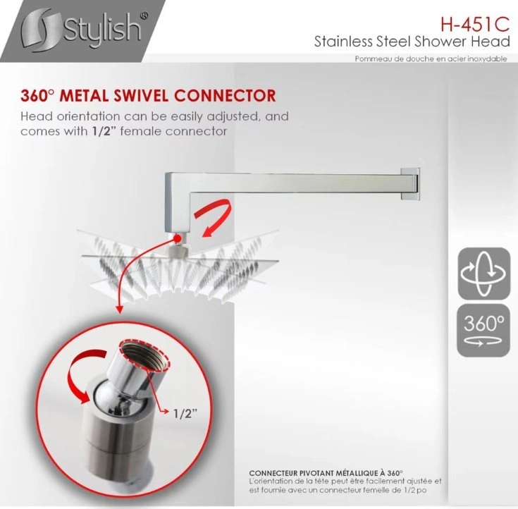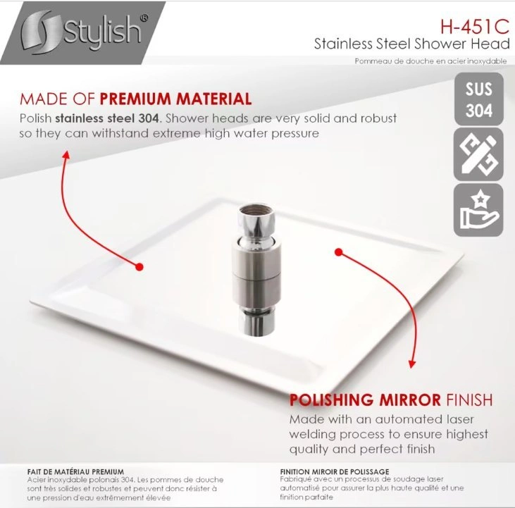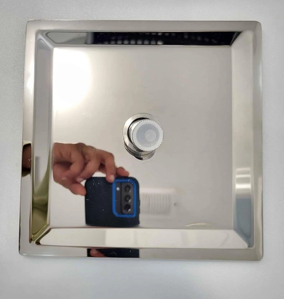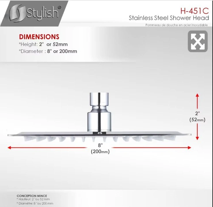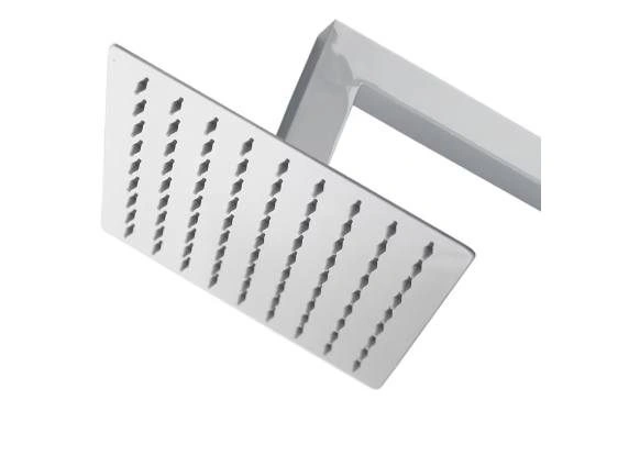 12Chrome finish shower head is highly reflective for a mirror-like look that works with any decorating style, ageless yet fashion-forward presence. - Square 8" (200x200 mm) - Polished mirror finished - Grey silicone nozzles - 2mm thickness - Metal swivel ball connector - Include water flow regulator - Maximum flow 9L / min