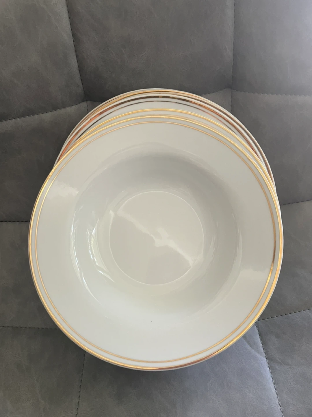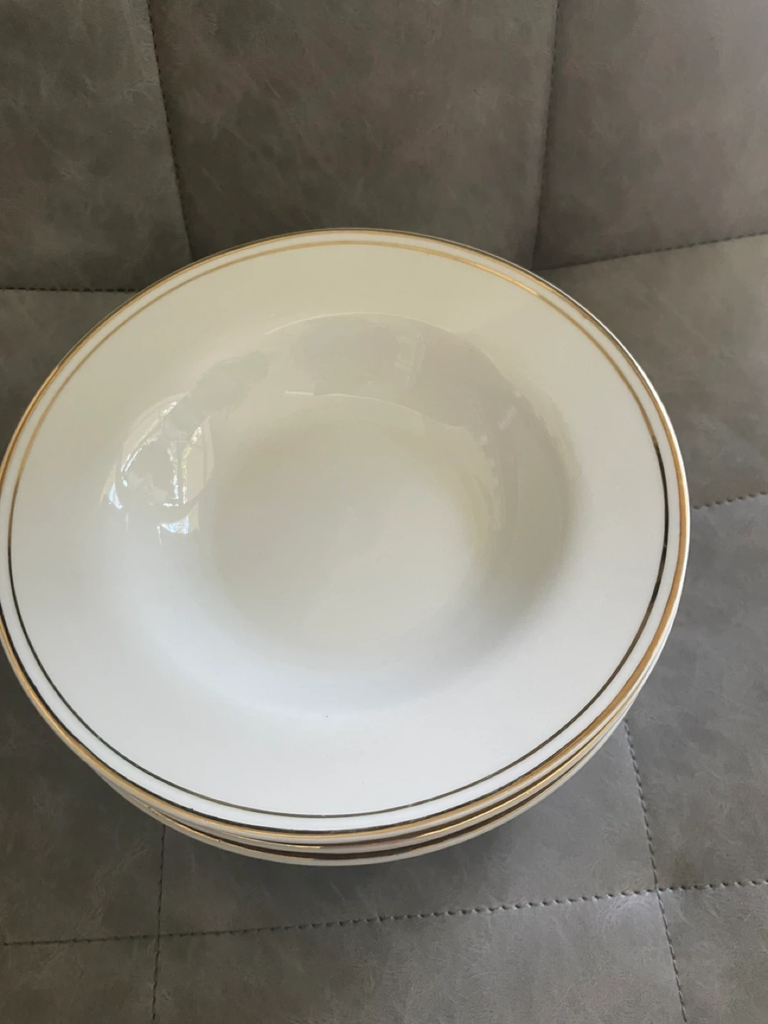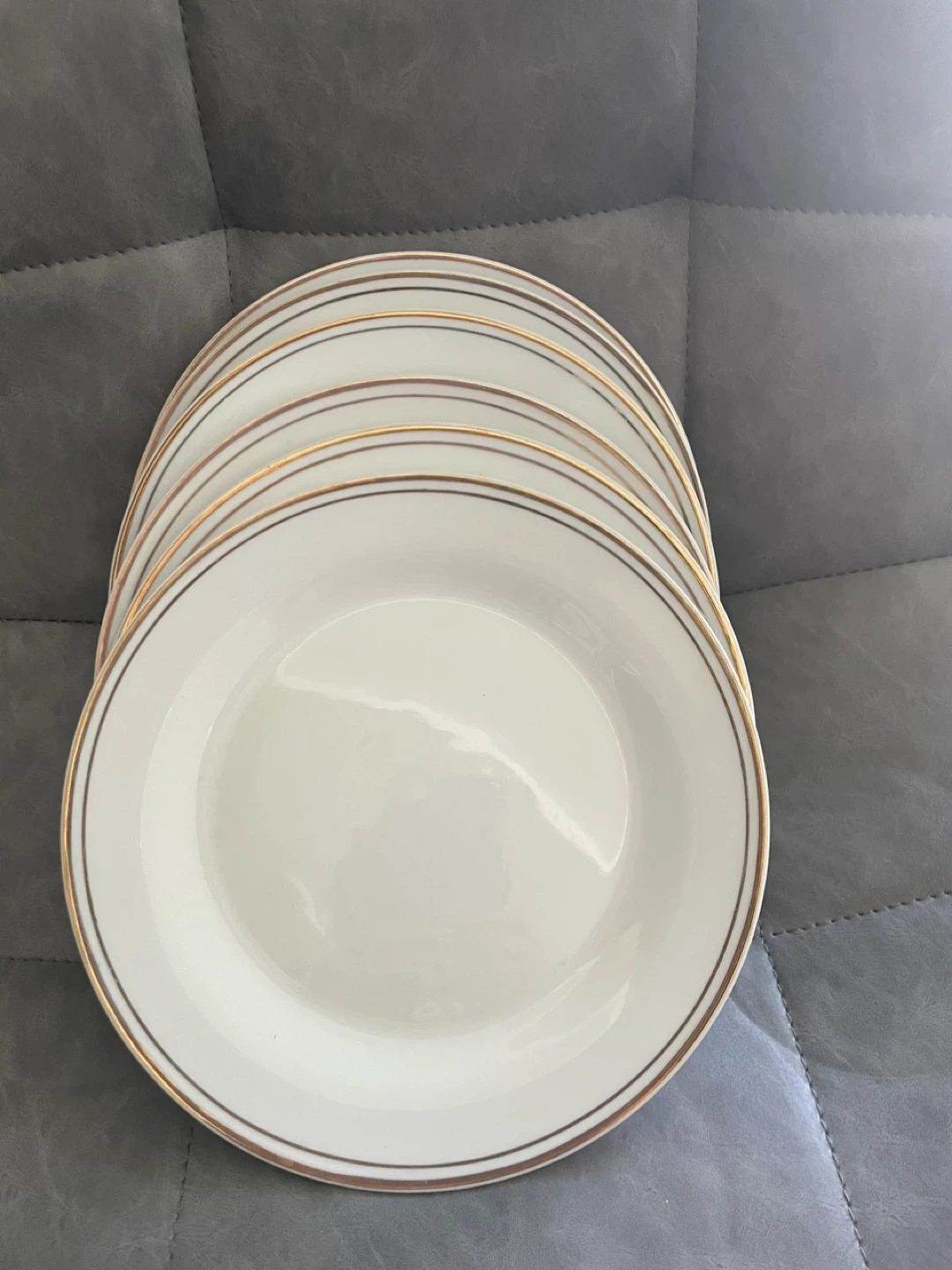 Selling a set of dinner plates with a lovely gold trim Amd matching bowls. They're perfect for adding a touch of elegance to your dining table. They are in good condition and ready for a new home!