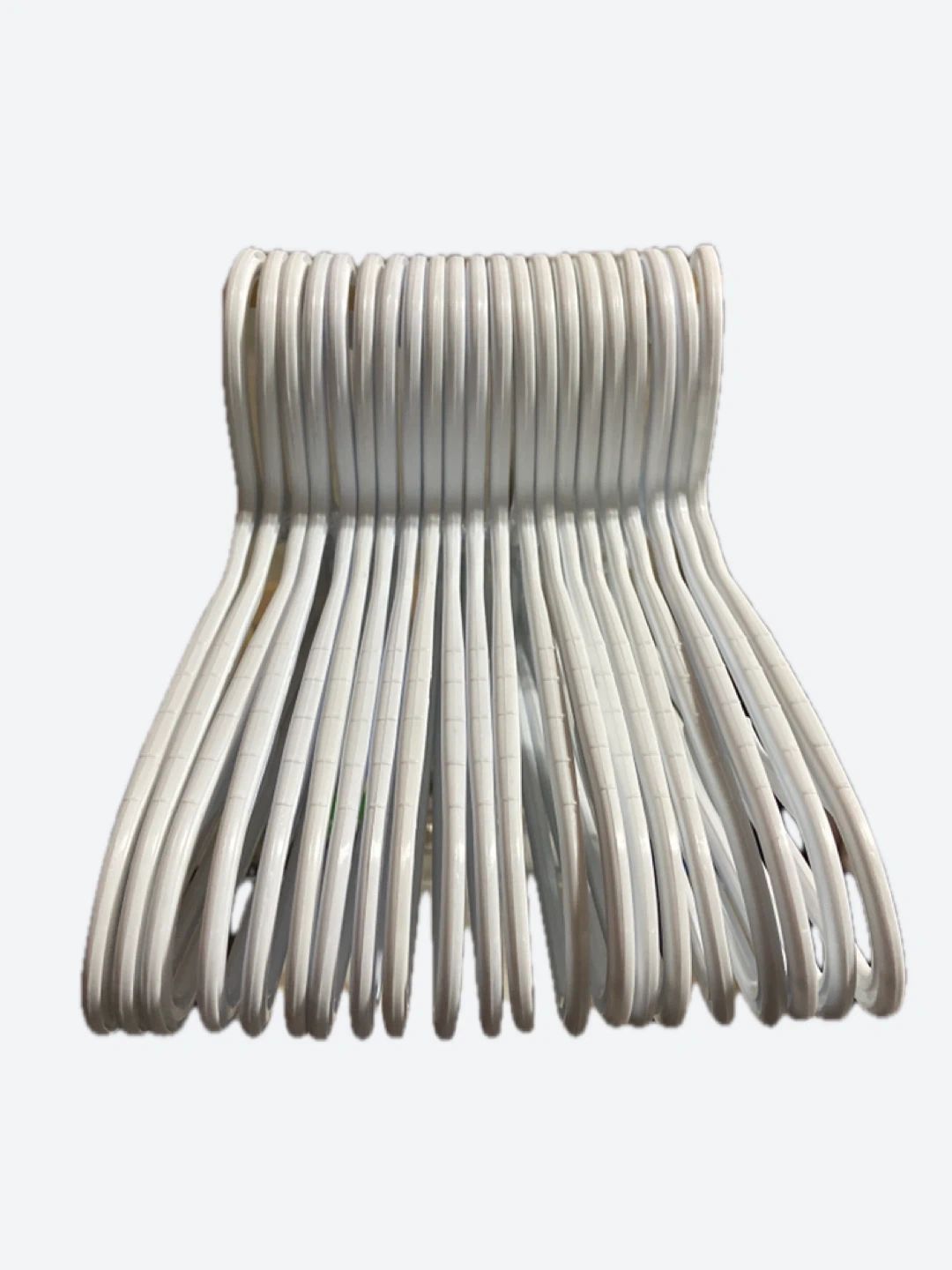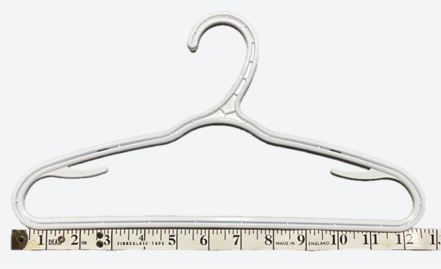 Selling a set of 21 white plastic clothes hangers. They are in great condition and ready to help organize your closet! 12 inches across; perfect for kid’s clothing or small adult.